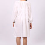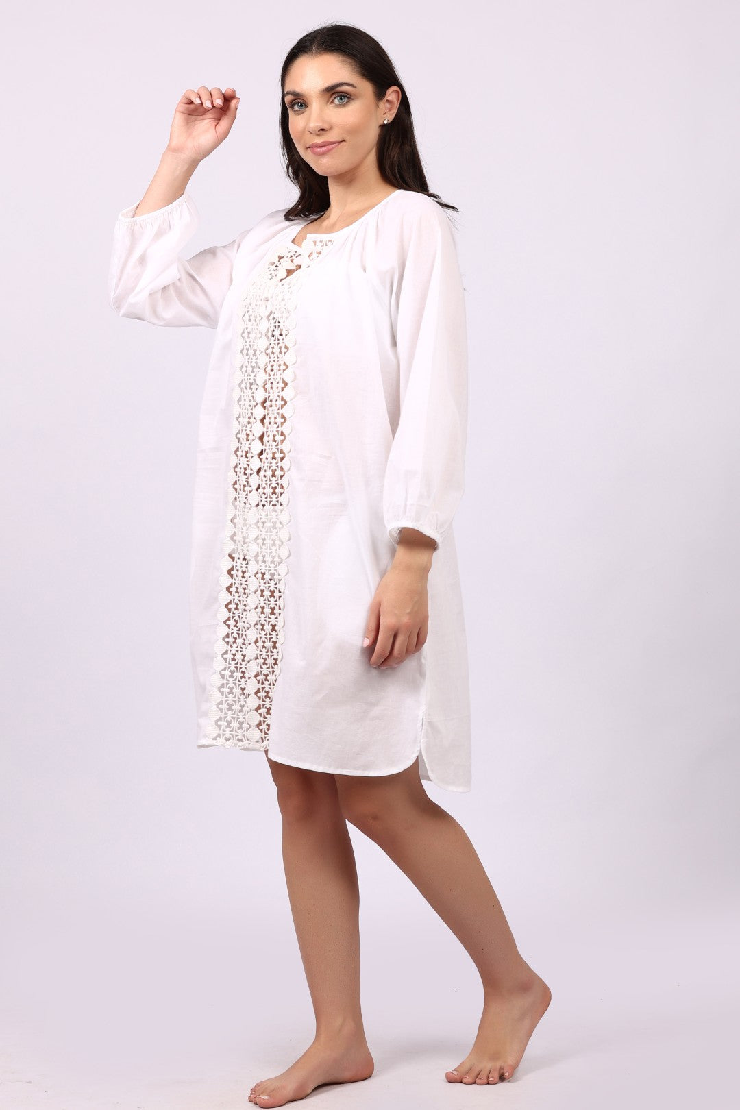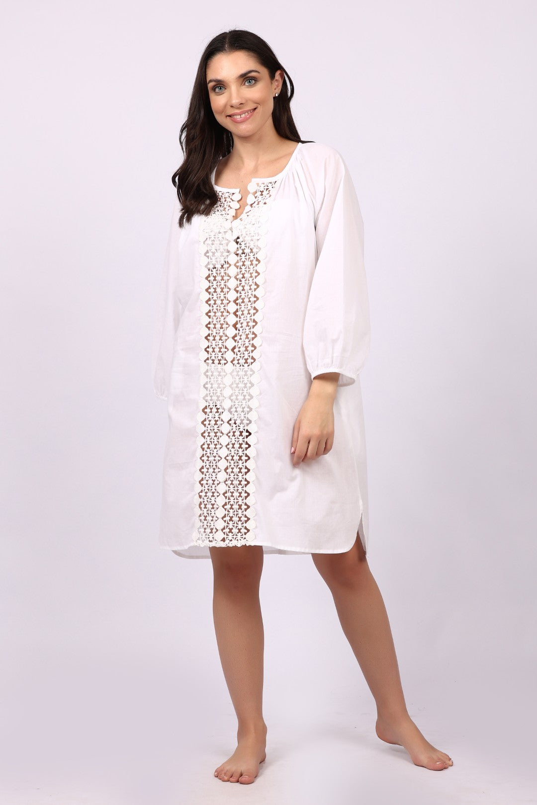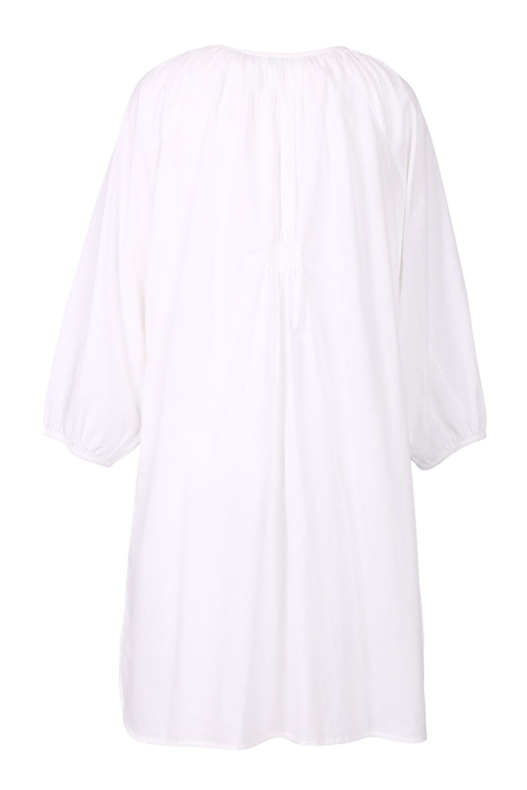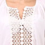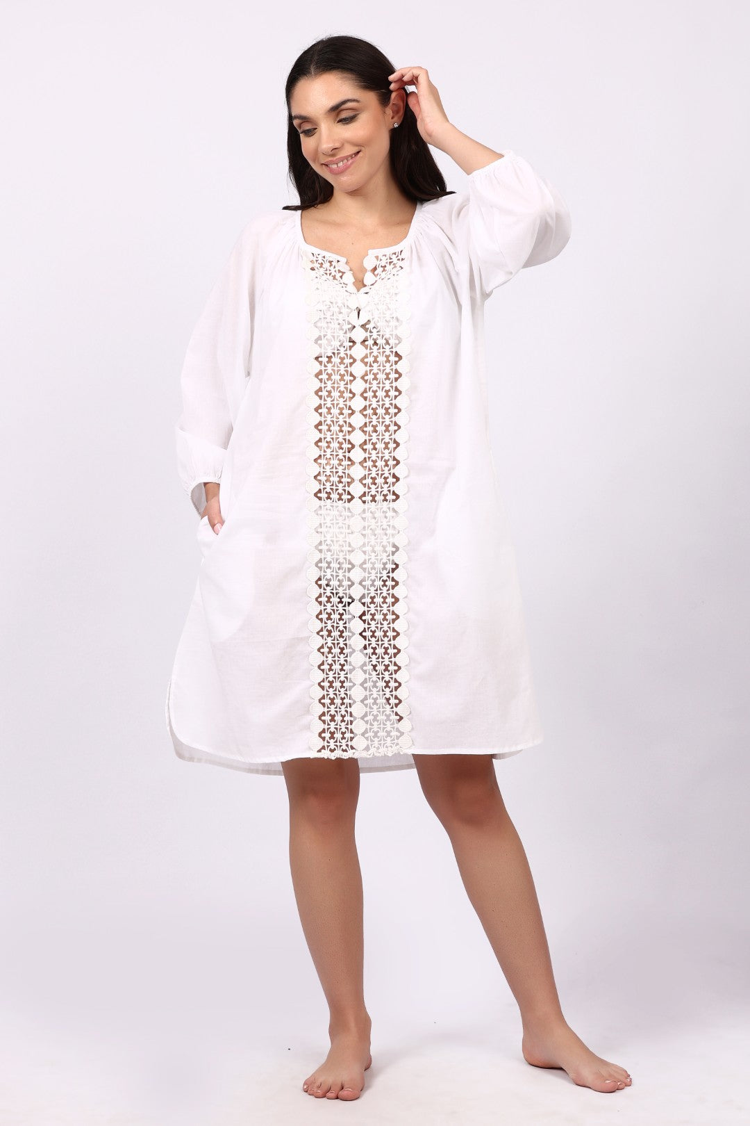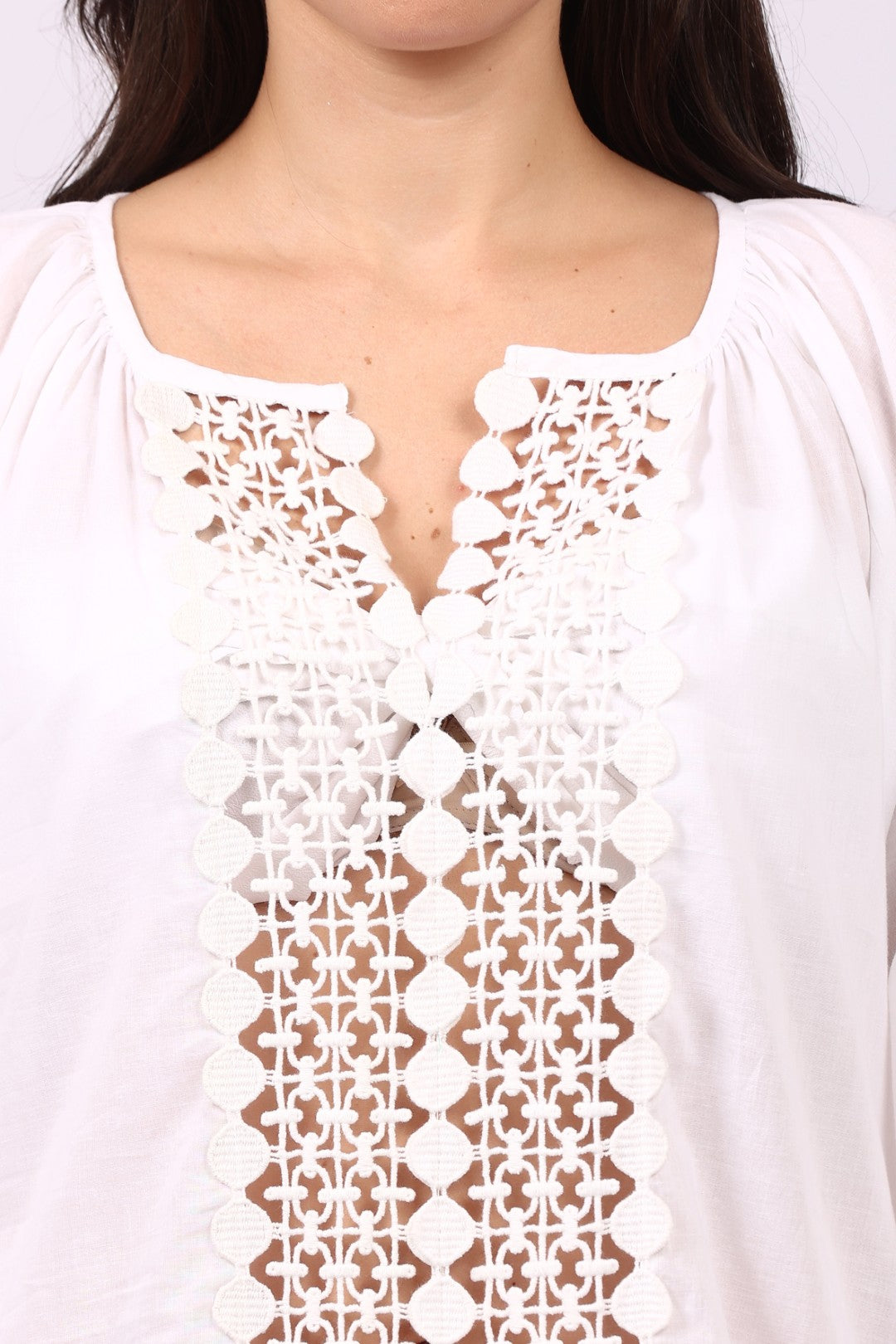 The Kokomo features a striking full-length crochet panel down the front, adding texture, movement and a touch of artisanal detail to an otherwise simple silhouette. Gentle gathers at the neckline create an airy, flattering drape through the body, while the long blouson sleeves with elastic cuffs offer lightweight coverage without ever feeling heavy or warm.