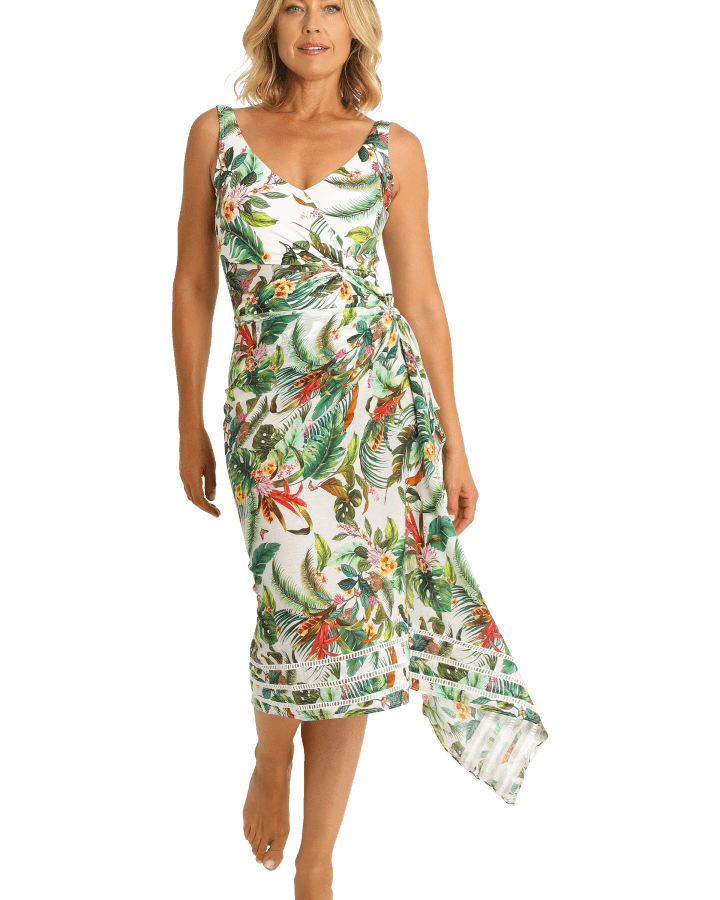 The Jantzen Meka Ladder Trim Sarong in white is made of a beautiful cheesecloth cotton that needs no ironing. With a 60cm length it should drape just below the knee with shaped tie ends to make a flowing swim costume cover up. This type of resort wear so is versatile as it can be worn by the pool, at the beach and around the resort and a lovely compliment to a Meka swimsuit in the same collection or a solid colour costume.
