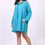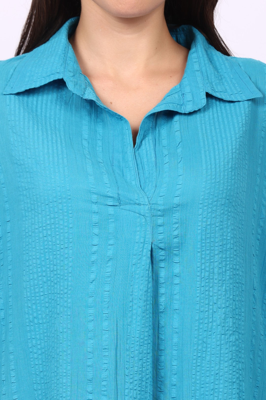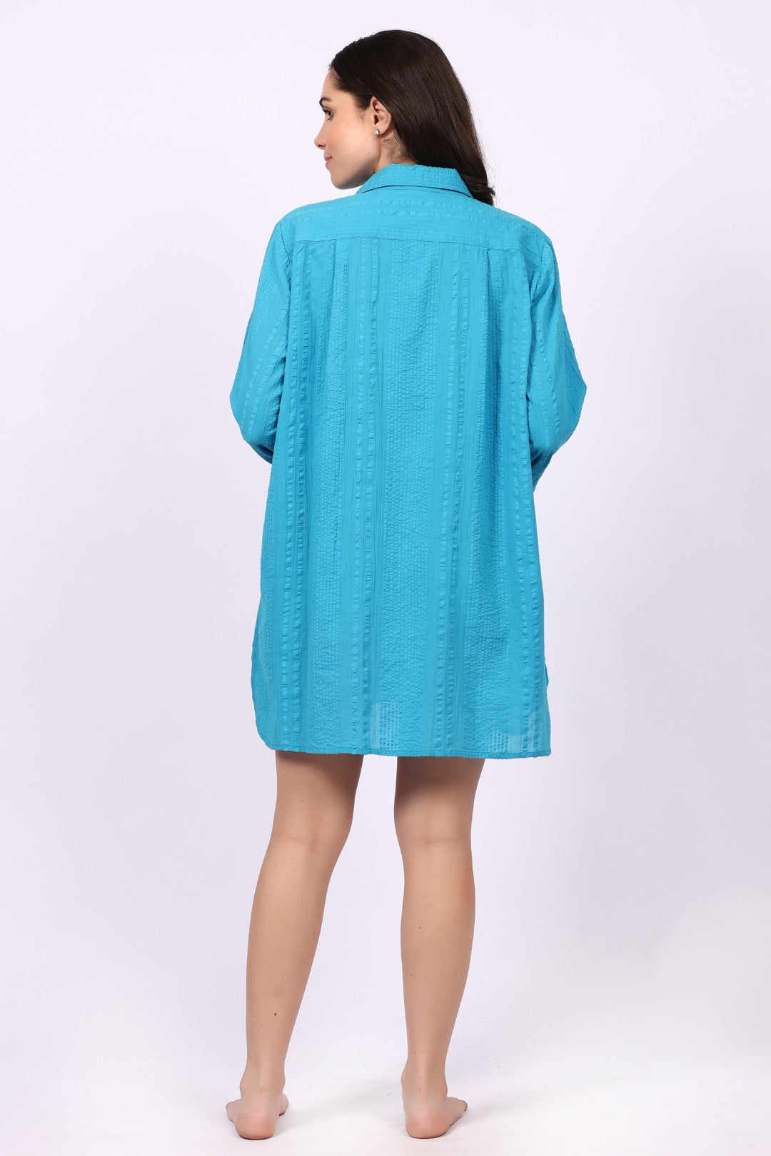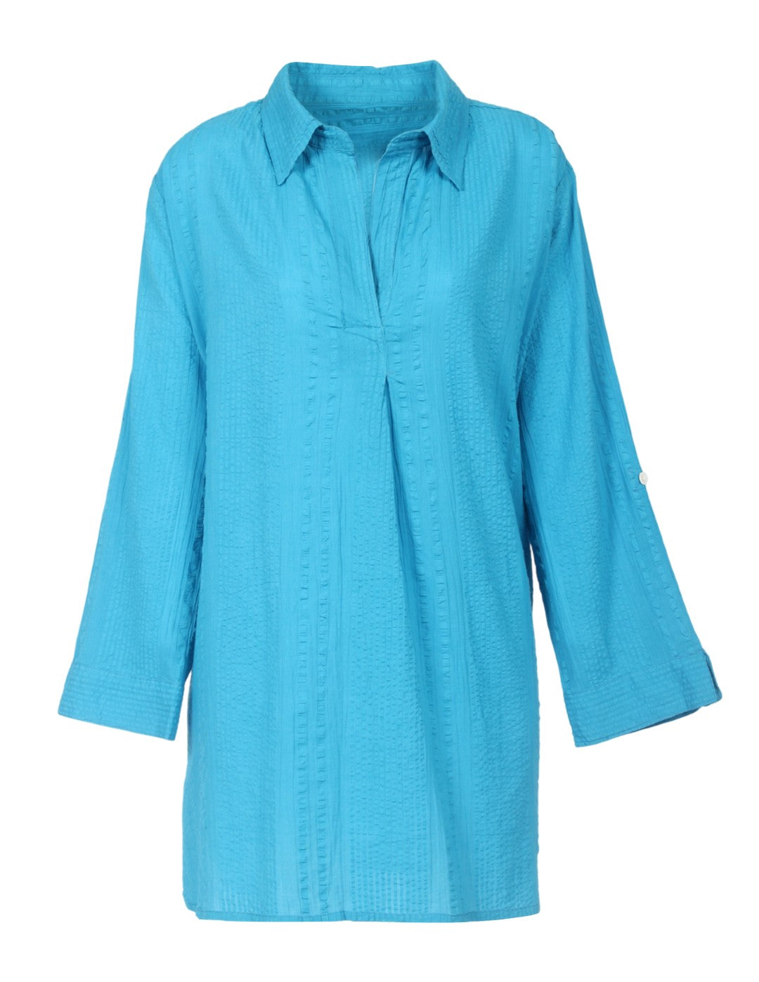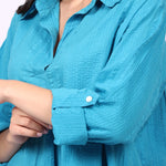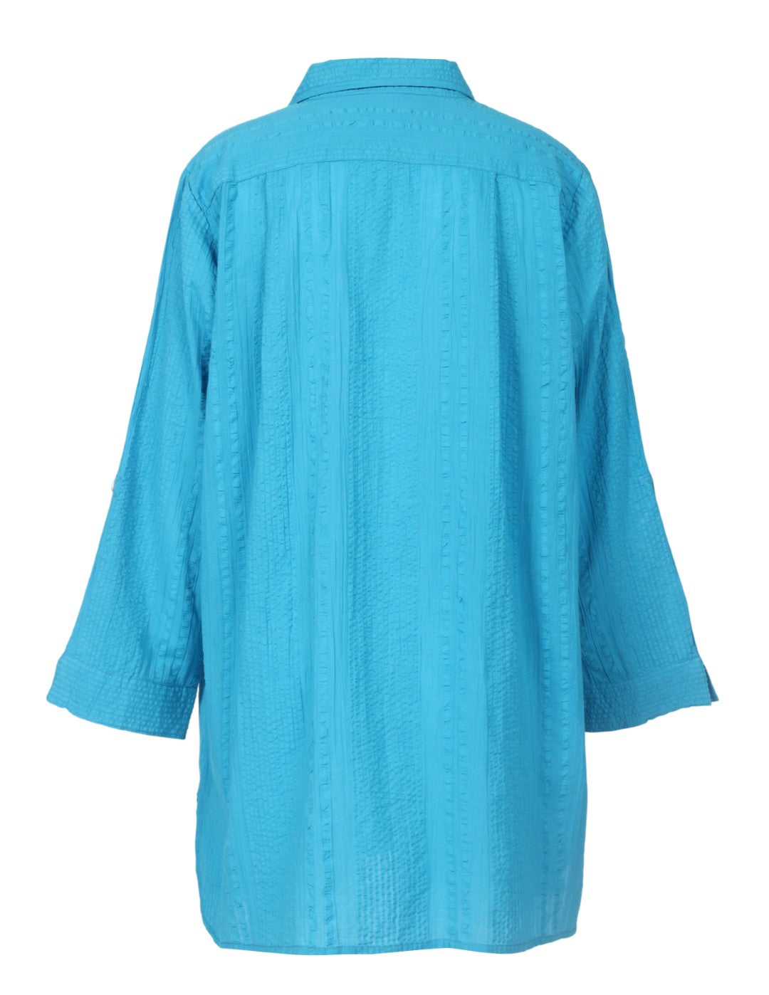 The subtle self-stripe texture adds refined detail to the fresh Blue Danube colourway, making it stylish enough for resort wear yet easy and casual enough for everyday coastal living. Designed with a relaxed silhouette, soft collar, roll-tab sleeves and a flattering curved hemline, it’s a versatile piece that can be worn buttoned, open, half-tucked, or simply thrown over your favourite swimsuit.
