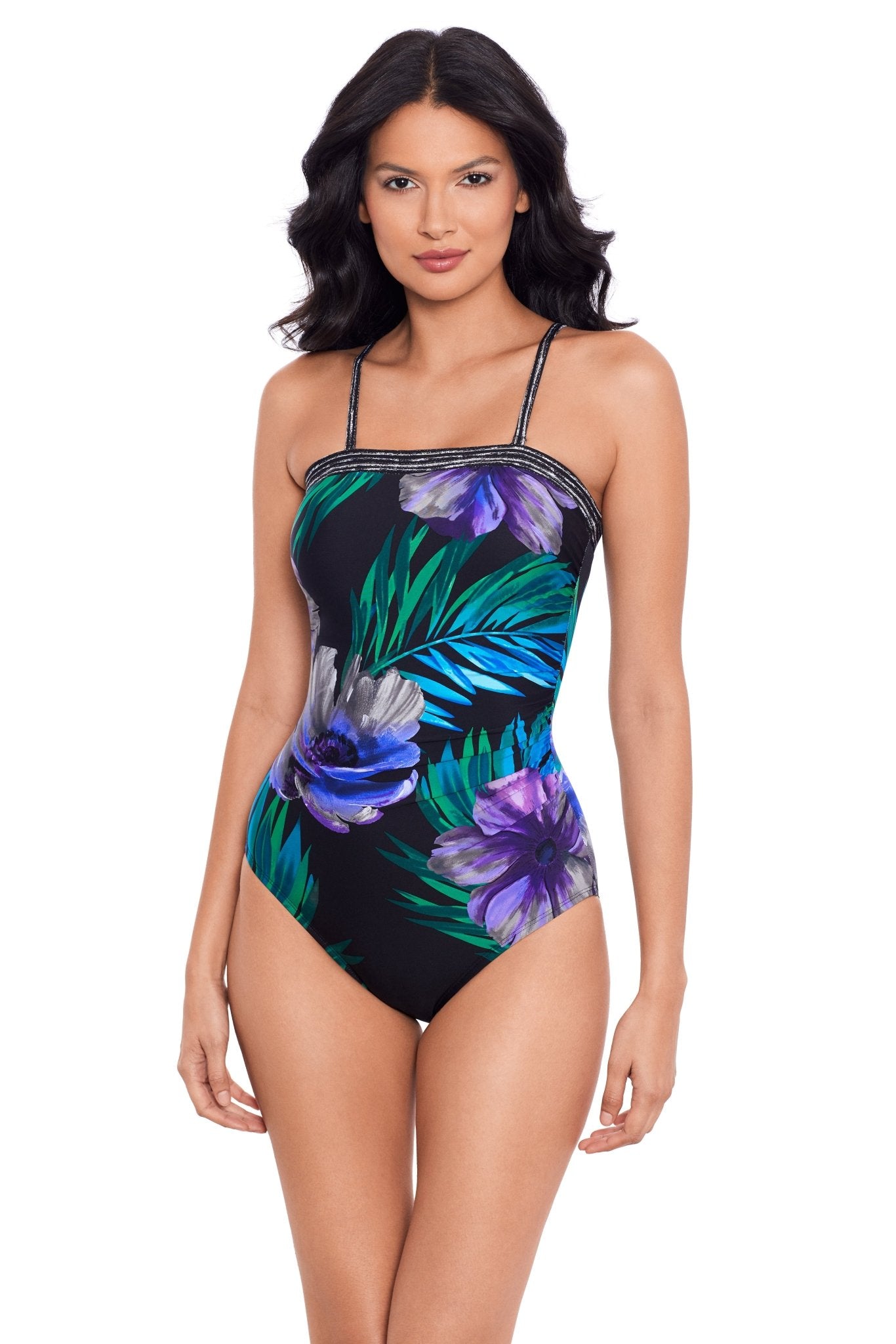 By Miraclesuit, the Avanti One Piece Bandeau Swimsuit in the Flora Aura collection is a stunning swim costume for women. With removable straps the bandeau neckline has gripper tape to secure and hidden underwire for bust support, best suited C-D cups. The Powermesh support gives a firm feel.