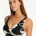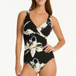 Sea Level La Luna Cross Front Multifit One Piece Swimsuit has a stunning black base fabric with blurred ivory floral and a hint of navy blue. A great, versatile style to suit all body shapes.