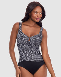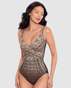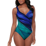 The new Maldiva "It's a Wrap" is a stunning one piece swimsuit by MiracleSuit. With claims that you will "look 10lb lighter in 10 seconds" these MiracleSuit swim costumes really do deliver miracles with strong shapewear-like support. Foam cups and underwire, this beautiful wrap front costume in blue and green and glints of gold. Available in a matching pareo sarong, sold separately.
