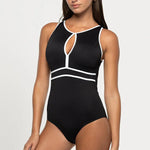 Nip Tuck Promised Aphrodite Jane High Neck One Piece Swimsuit in black features soft moulded multifunctional cups that comfortably support cup sizes C to DD. Its body-contouring powermesh and high-elastane lining offer gentle shaping and lasting comfort. The elegant front cutout adds subtle style while providing coverage, complemented by bind trim details for a clean finish. A keyhole back with a secure clip ensures easy wear and removal. Crafted from durable, soft-touch fabric, this swimsuit combines style, support, and sun protection for a confident, flattering fit.