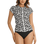 Sunseeker Soho Short Sleeve Rash Vest in black and white geometric print with white zip front is a great coverup for summer. It has UPF50+ sun protection, removable soft cup and an inner shelf bra which is a perfect multifit sun shirt for A - D cup busts.