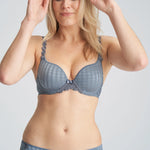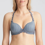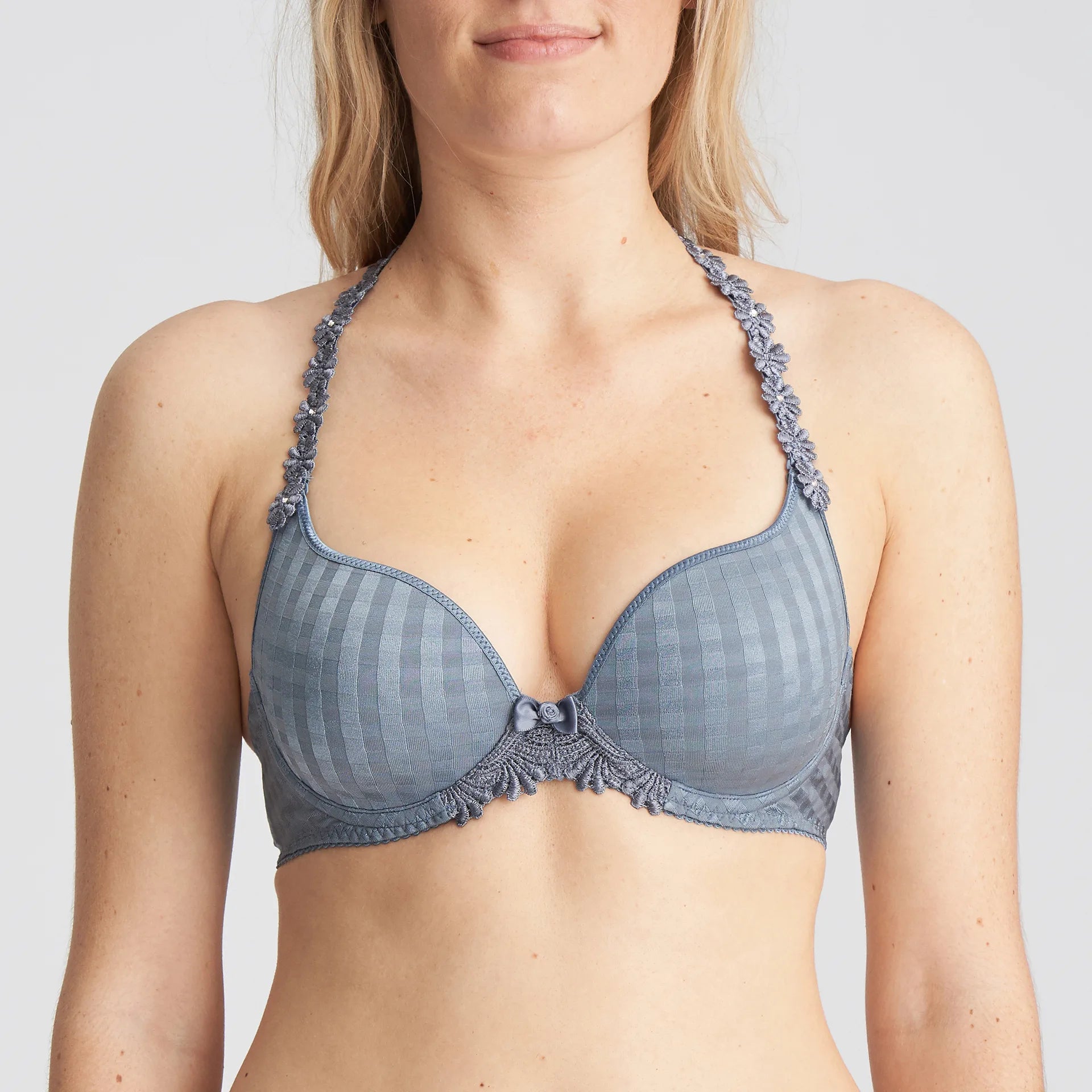 Front view of the Marie Jo Avero Heart Shape Contour Bra in Atlantic Blue, showing light denim blue tone with daisy strap detail.