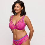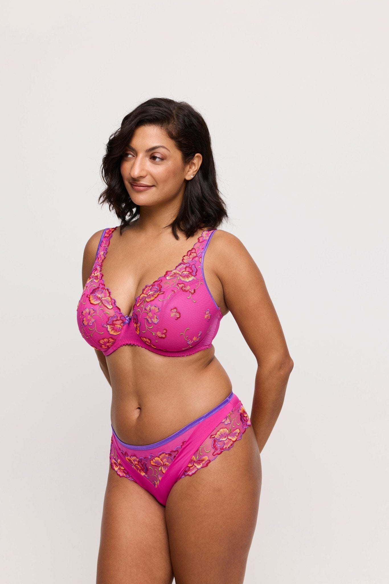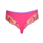 Crafted from a vibrant fuchsia base, the design is enriched with floral embroidery in striking shades of orange, green, lilac, and purple, creating a colourful and feminine statement. The smooth waistband ensures comfort, while the embroidered tulle inserts add elegance and allure.