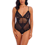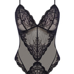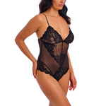 Stunning Vivid Attraction Black Bodysuit features stretch lace with floral motif set on a sheer net. Perfect bodysuit for under a jacket for the intimates as outerwear trend.
