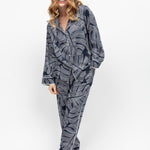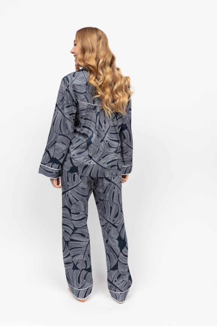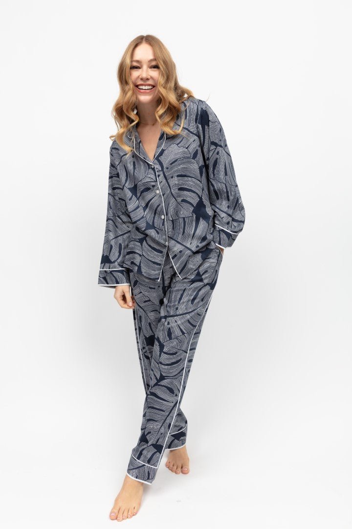 The pyjama top features a shaped revere collar adorned with a chic silver monstera leaf print against a deep navy background, exuding elegance and sophistication. Delicate cuffed long sleeves with modal piping and binding add a touch of refinement, while white embossed buttons with a subtle print enhance the overall charm.