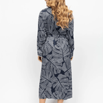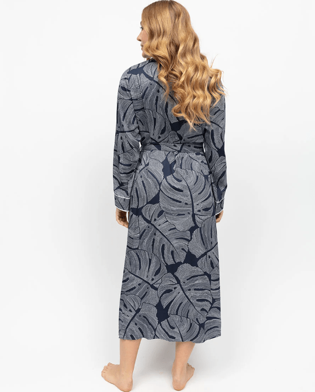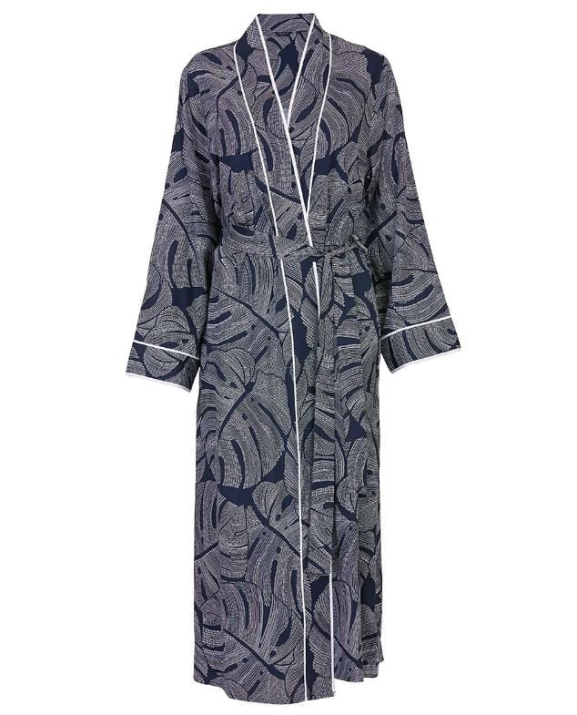 Meticulously crafted from a soft blend of 68% modal and 32% cotton, and printed with a graceful silver monstera leaf print on a deep navy canvas, this dressing gown is the perfect mix of comfort and natural elegance.