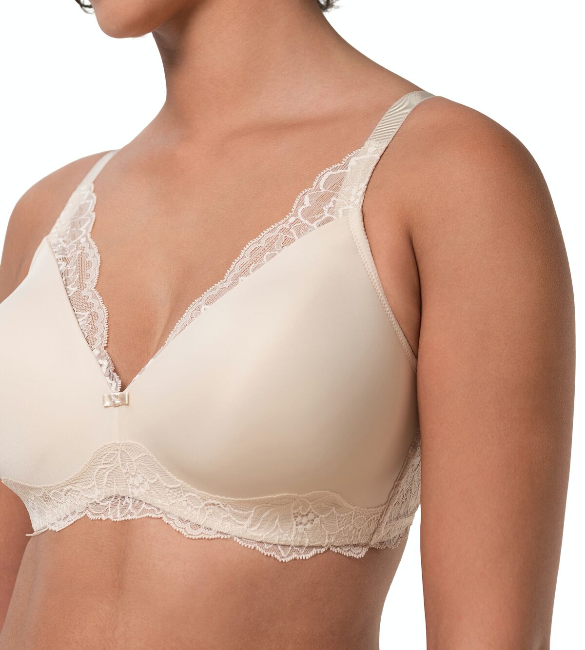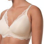 Close up of The Foundation’s Amourette Charm Non Wire Bra in Creamy Dream, showing lace-trimmed cups and soft padded design.