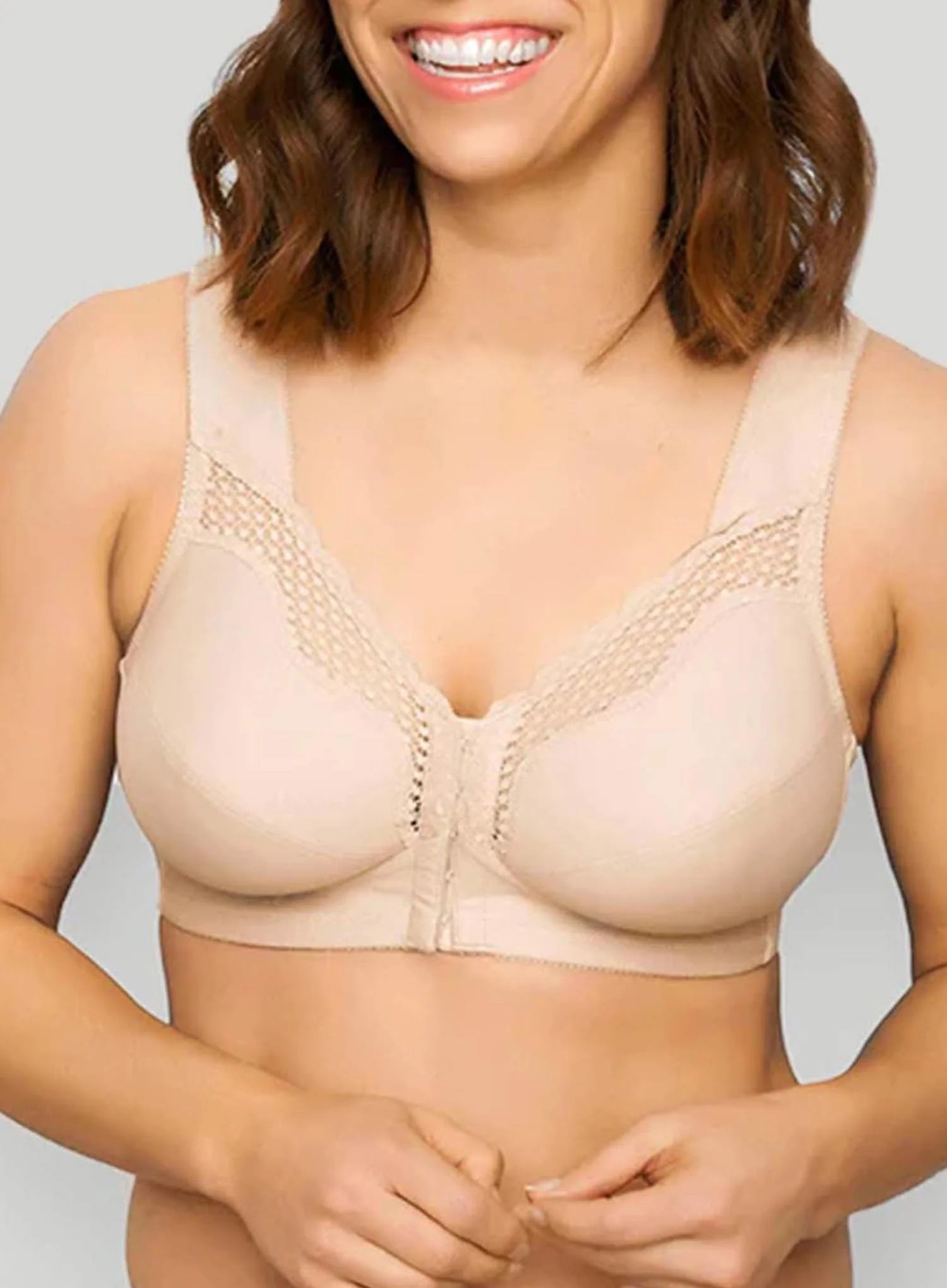 The EXQUSITE FORM Front Close Cotton Posture Bra in Nude is expertly designed to offer an exceptional combination of comfort, support, and posture enhancement. Tailored for fuller figures, this plus-size bra balances functionality with a natural, flattering shape through its unlined, wire-free cups. Its tall back with criss-cross elastic bands delivers superior support while promoting proper shoulder alignment. Featuring a soft-backed hook-and-eye front closure for ease of use and wide, padded, non-adjustable straps for all-day comfort, this bra is particularly recommended by our fit specialists for women with limited shoulder mobility. A practical and comfortable wardrobe essential.