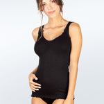 Black ribbed camisole from EGI shown in angled pose, with focus on upper body contour.