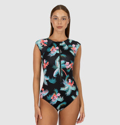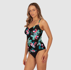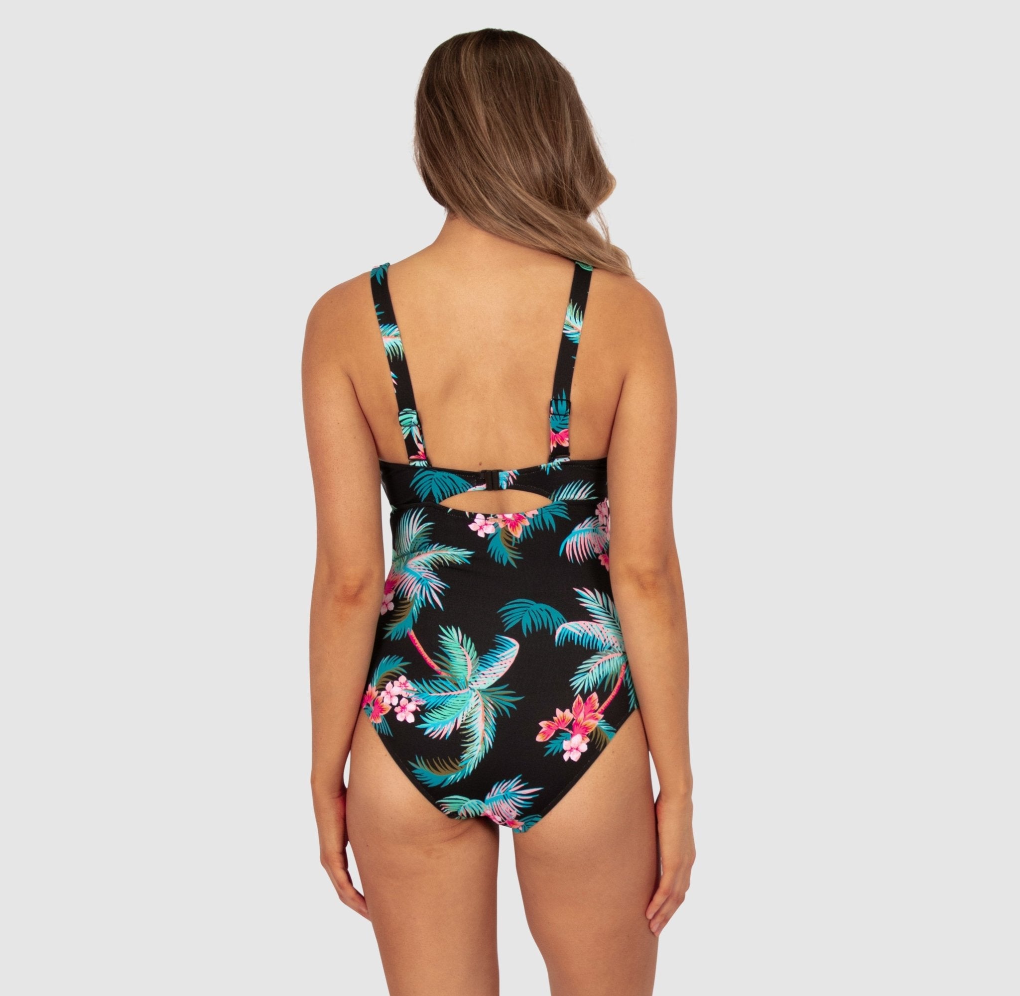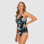 The Amalfi collection from Baku is a superior and lightweight Italian microfibre fabrication made with Lycra Xtra Life for ultra chlorine resistance. The vibrant tropical print on a black base fabric is made up of palm leaves intertwined with delicate florals in pink and coral.