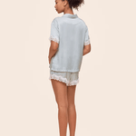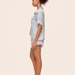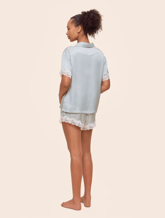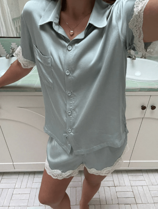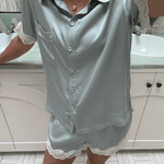The relaxed cut top features beautiful lace detailing and satin finish, paired with relaxed boxer shorts with an elastic waistband for easy wear. Lightweight and airy, this set is ideal for those looking for satin PJ set, lace boxer pyjamas, women’s satin sleepwear, or breathable lounge pyjama set.