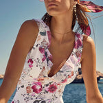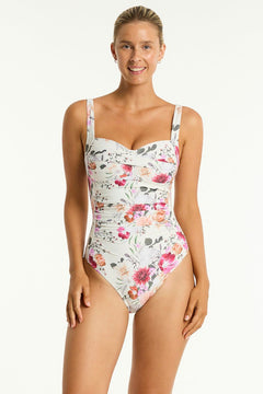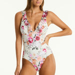 From Sea Level, the Belle Frill One Piece Swimsuit in this beautiful coconut colourway, best suits A to DD cup busts. The plunging v-neckline is edged with a double frill in matching mesh. It has removable soft cups to give more depth for the bigger bust and with adjustable and convertible straps you can achieve a different look and more support with a cross over back.