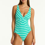 The Biarritz collection from Sea Level is crafted from a textured waffle base fabric. 70's nautical inspired bold stripes with gold hardware accents. Biarritz features powermesh lining in the front and back for optimal support.