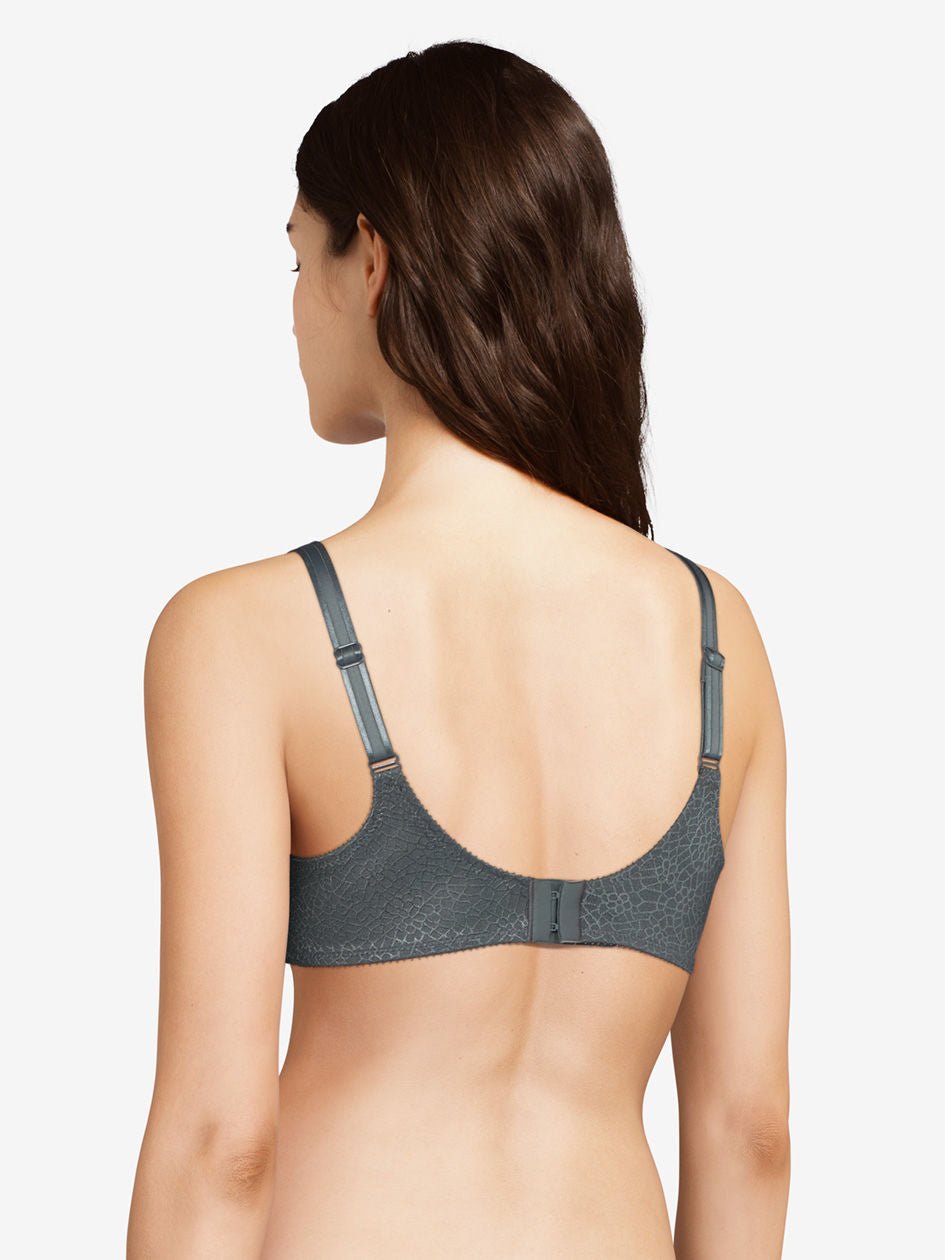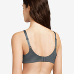 Model wearing the Chantelle C Magnifique Moulded Bra in Slate Grey from The Foundation, featuring full-coverage cups and smoothing back band.
