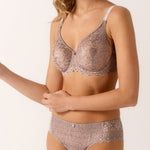 Model wearing Empreinte Cassiopee bra in Rose Sauvage, showcasing seamless full coverage and luxe embroidery.