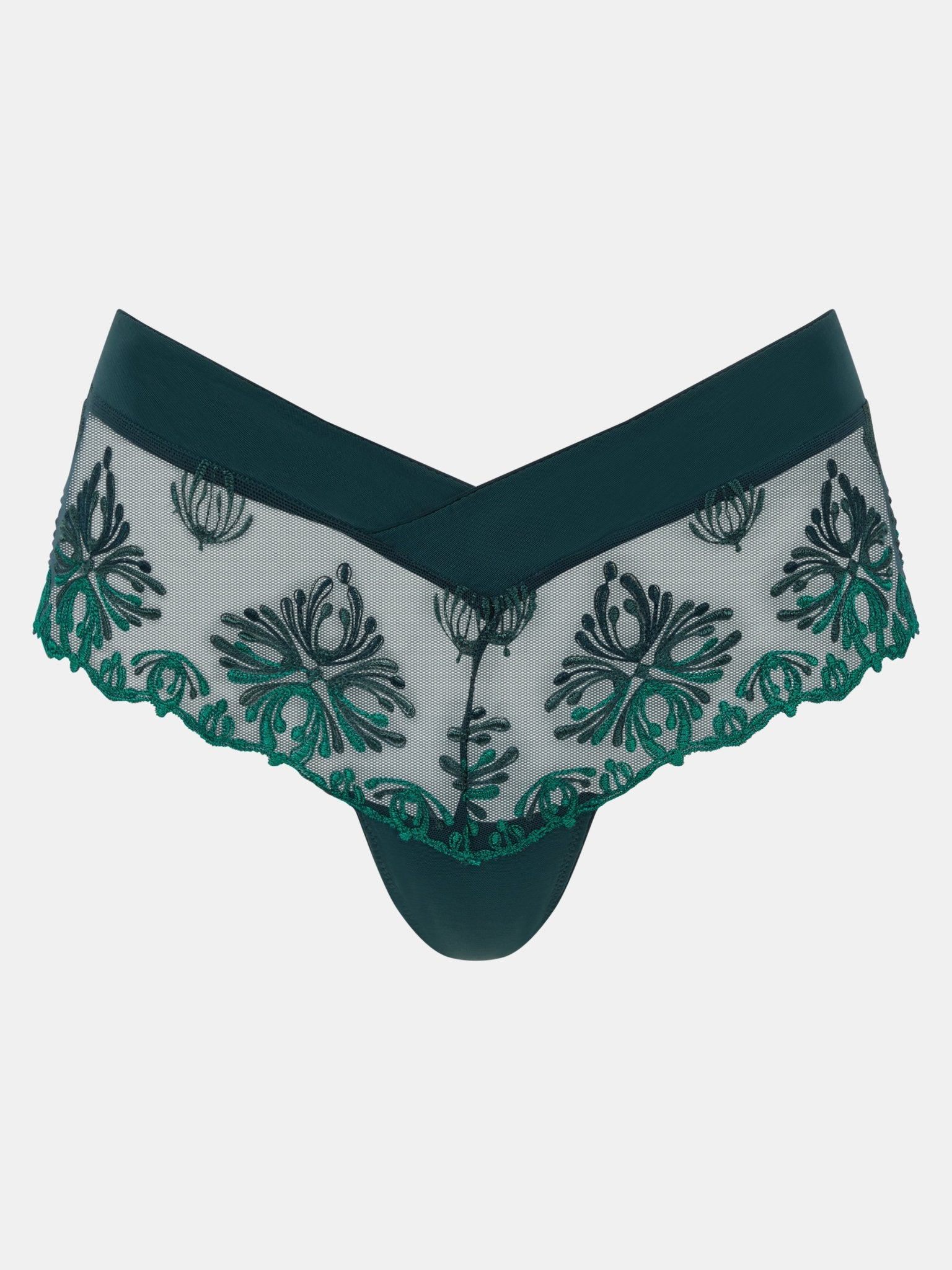 Chantelle Champs Elysees Revealing Shorty Brief in limited edition Eden Green is made of sheer, embroidered tulle with low-rise waist. It is a Hipster-style brief that is modern and sexy. Cheeky back coverage and a V-shaped waistband provides a seductive twist to this everyday style.