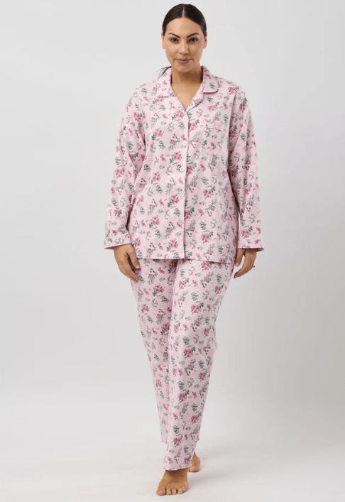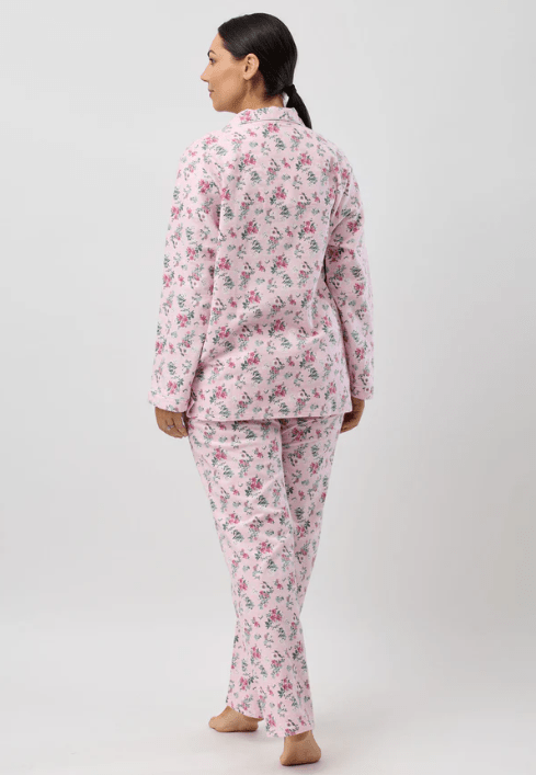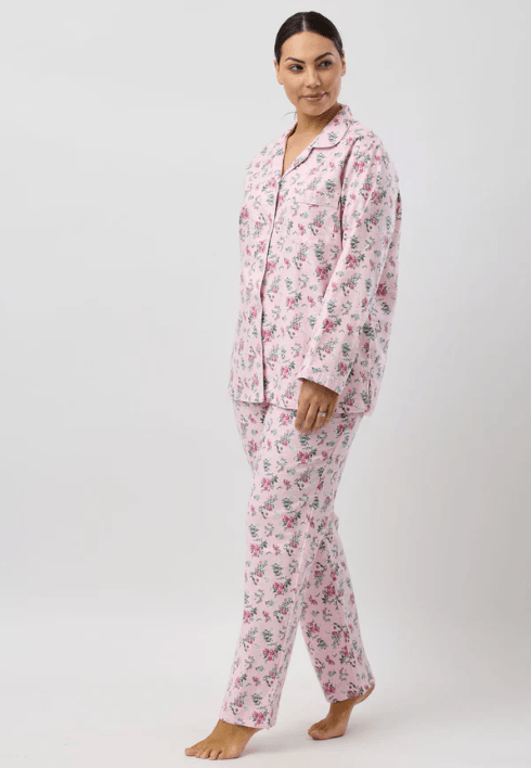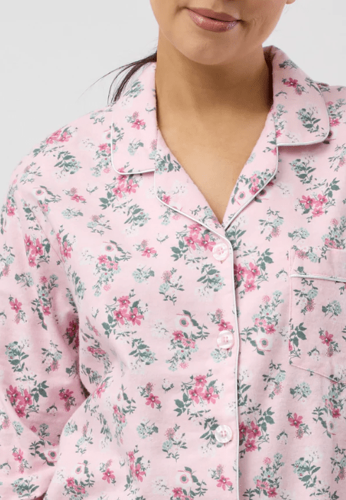 Indulge in ultimate comfort and style with our Crab Apple Revere PJ Set in pink. Crafted from cozy and luxurious brushed cotton flannelette, this set boasts elegant satin piping and a beautiful floral print. Get ready for a dreamy night's sleep.