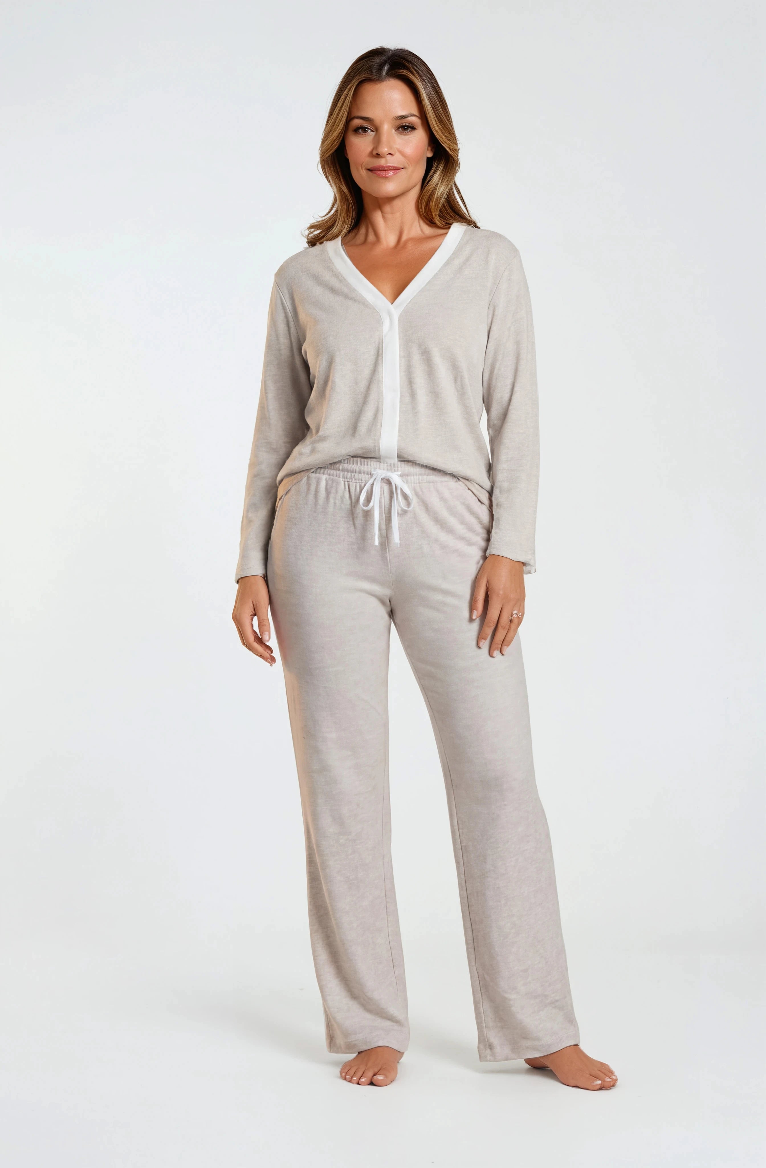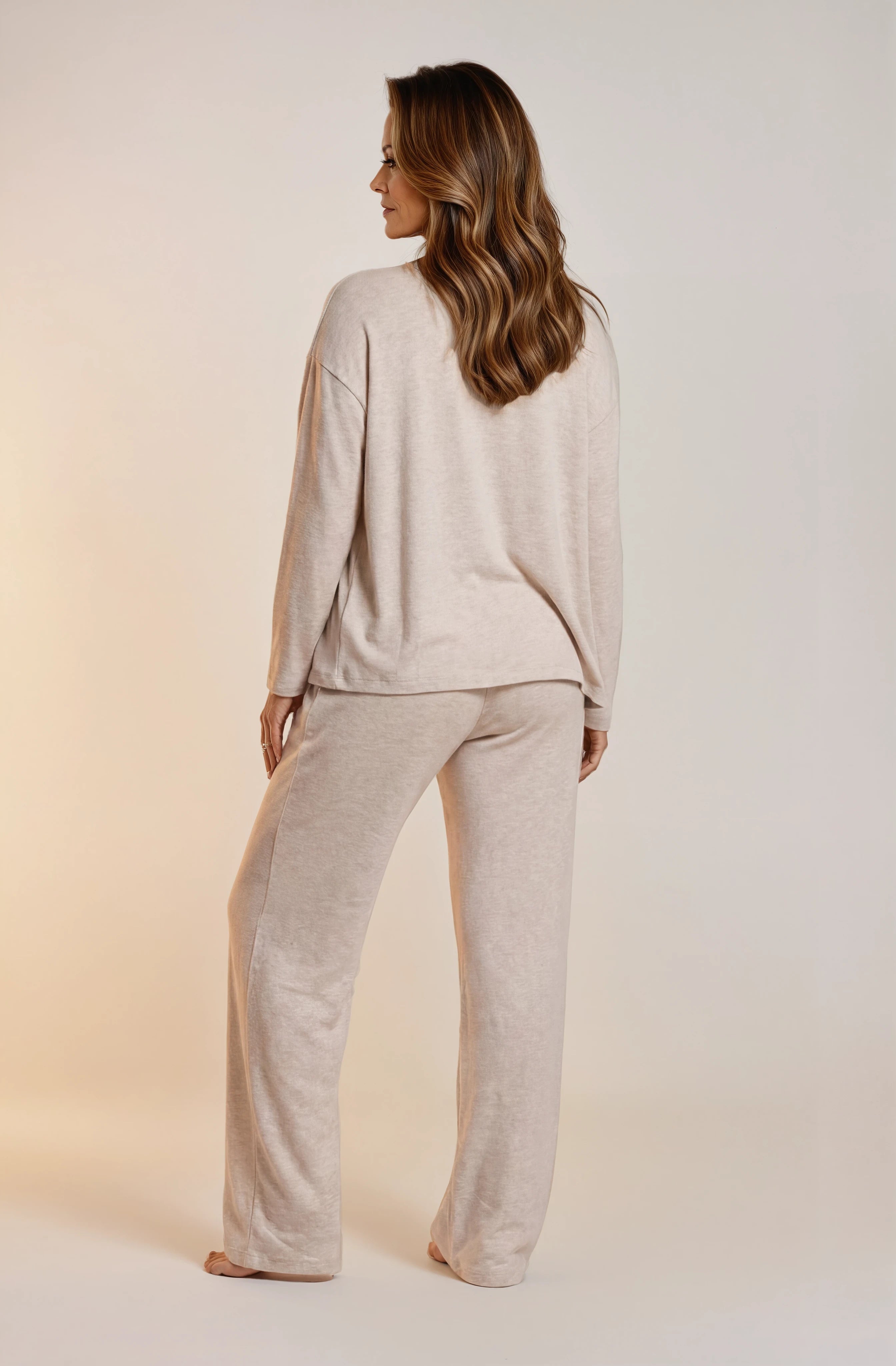 Soft, calming, and effortlessly wearable—the Dallas Peachy Jersey Lounge Set in Oatmeal is designed for women who appreciate comfort with a refined, natural feel. Crafted from a premium cotton/modal blend, this luxuriously soft peachy jersey fabric offers breathable warmth with a lightweight touch—perfect for cosy mornings, relaxed evenings, and everything in between.