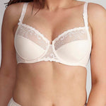 Model wearing Delice Control Full Cup Bra in blush with full coverage support and elegant embroidery.