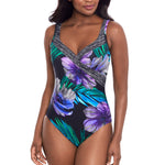 By Miraclesuit, the "It's a Wrap" one piece swimsuit for women in the Flora Aura collection is a stunning swim costume with shapewear-level support. The comfortable, yet firm-control shaping swimsuit flattens your tummy and provides smoothing. The crossover wrap front creates a v-neckline and with hidden underwire and padded foam cups for excellent bust support. Add the matching Pareo / Sarong in the same Flora Aura collection for a head-turning set.