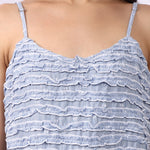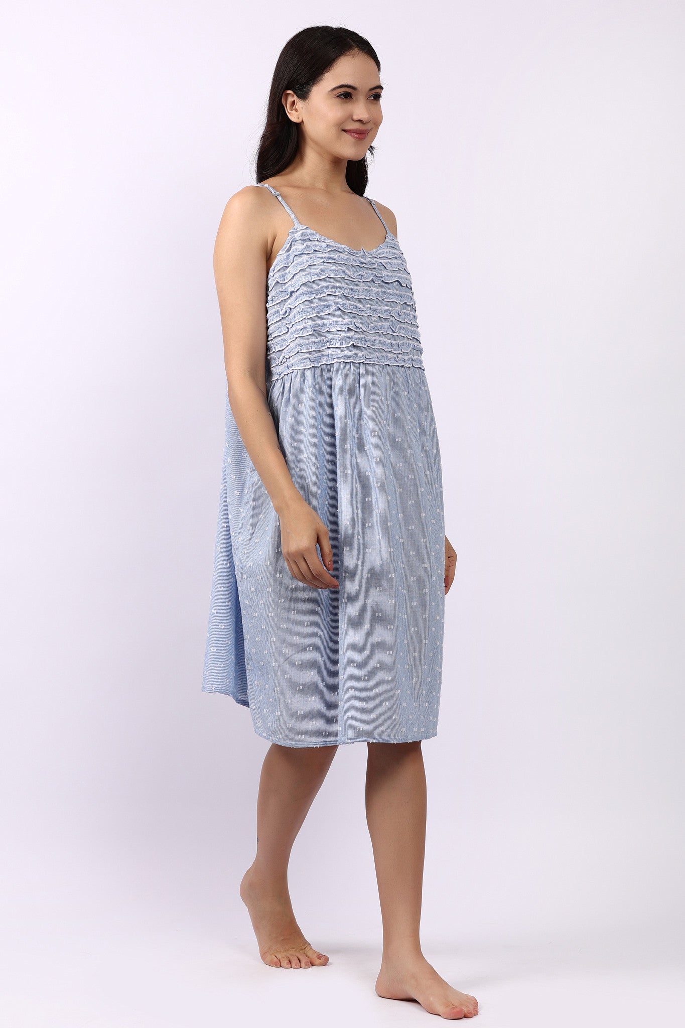The gently gathered bodice is adorned with rows of delicate frills, adding a feminine flourish while remaining easy to wear. Adjustable straps ensure the perfect fit, while the flowing silhouette drapes comfortably for cool comfort throughout the night.
