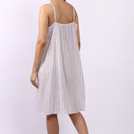 Woman wearing Lotus Frilly Nightie Sky Stripe, sleeveless cotton nightdress with frill detail back view