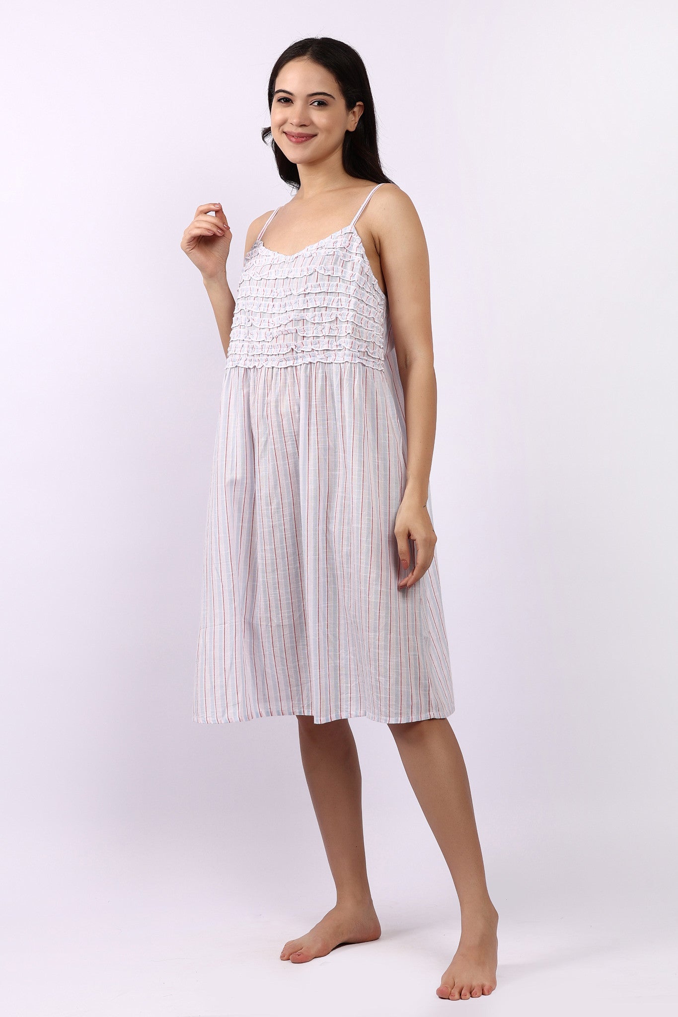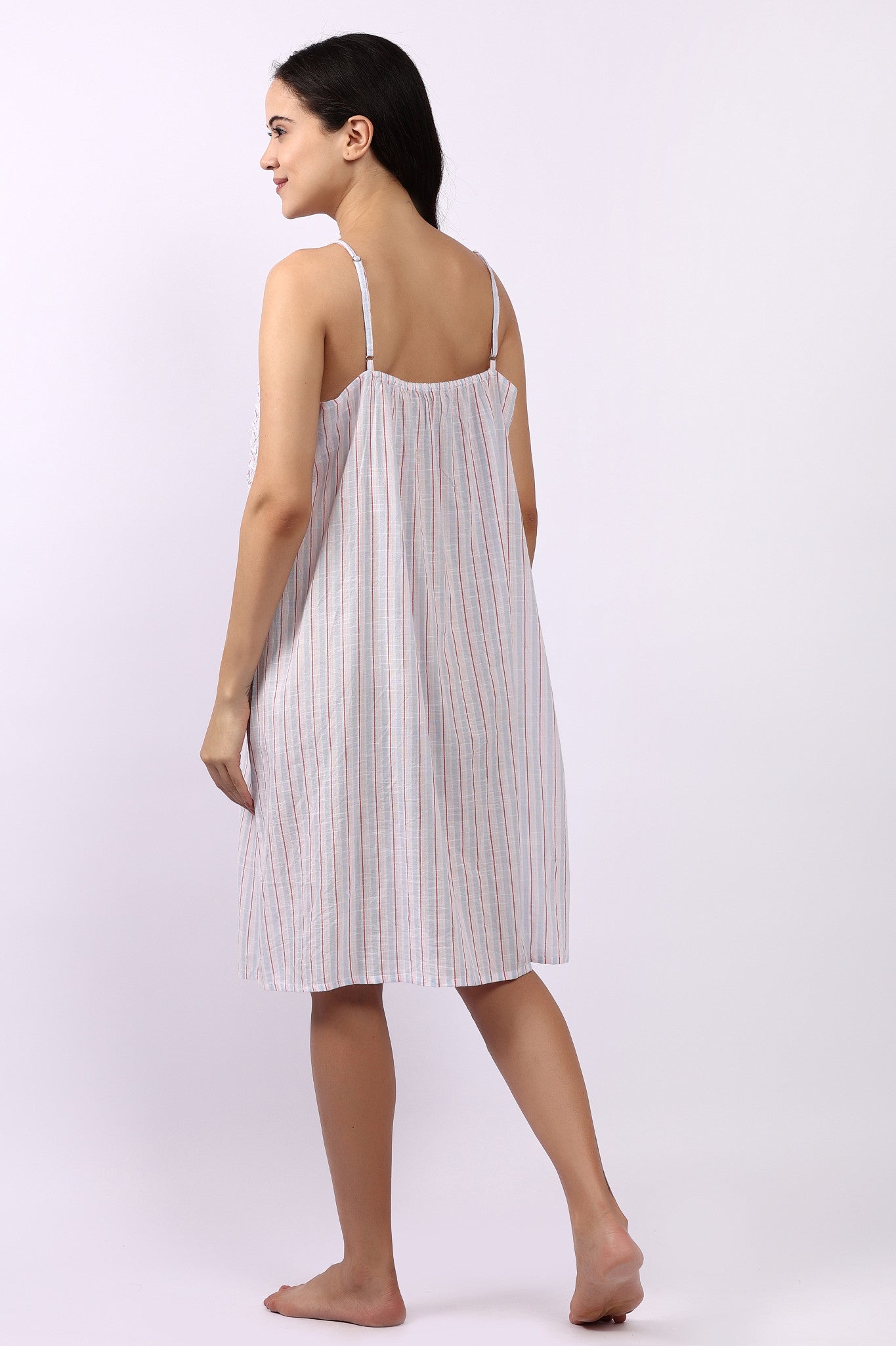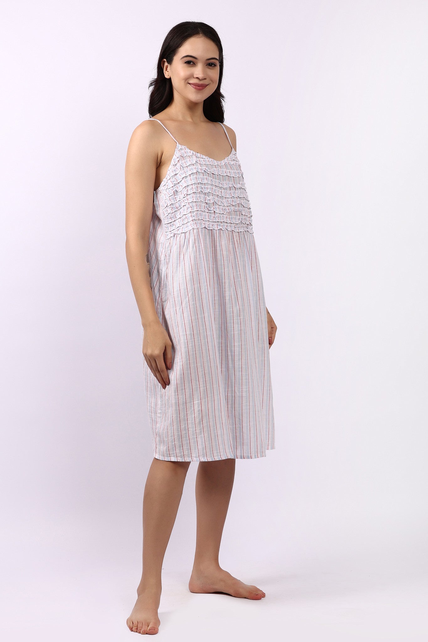 The bodice features layers of frill detailing, creating a playful yet elegant finish, while the sky-blue stripe design adds a fresh, timeless touch. Adjustable spaghetti straps ensure a personalised fit, and the relaxed A-line shape flows gently over the body for all-night comfort.