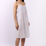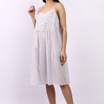 Woman wearing Lotus Frilly Nightie Sky Stripe, sleeveless cotton nightdress with frill detail