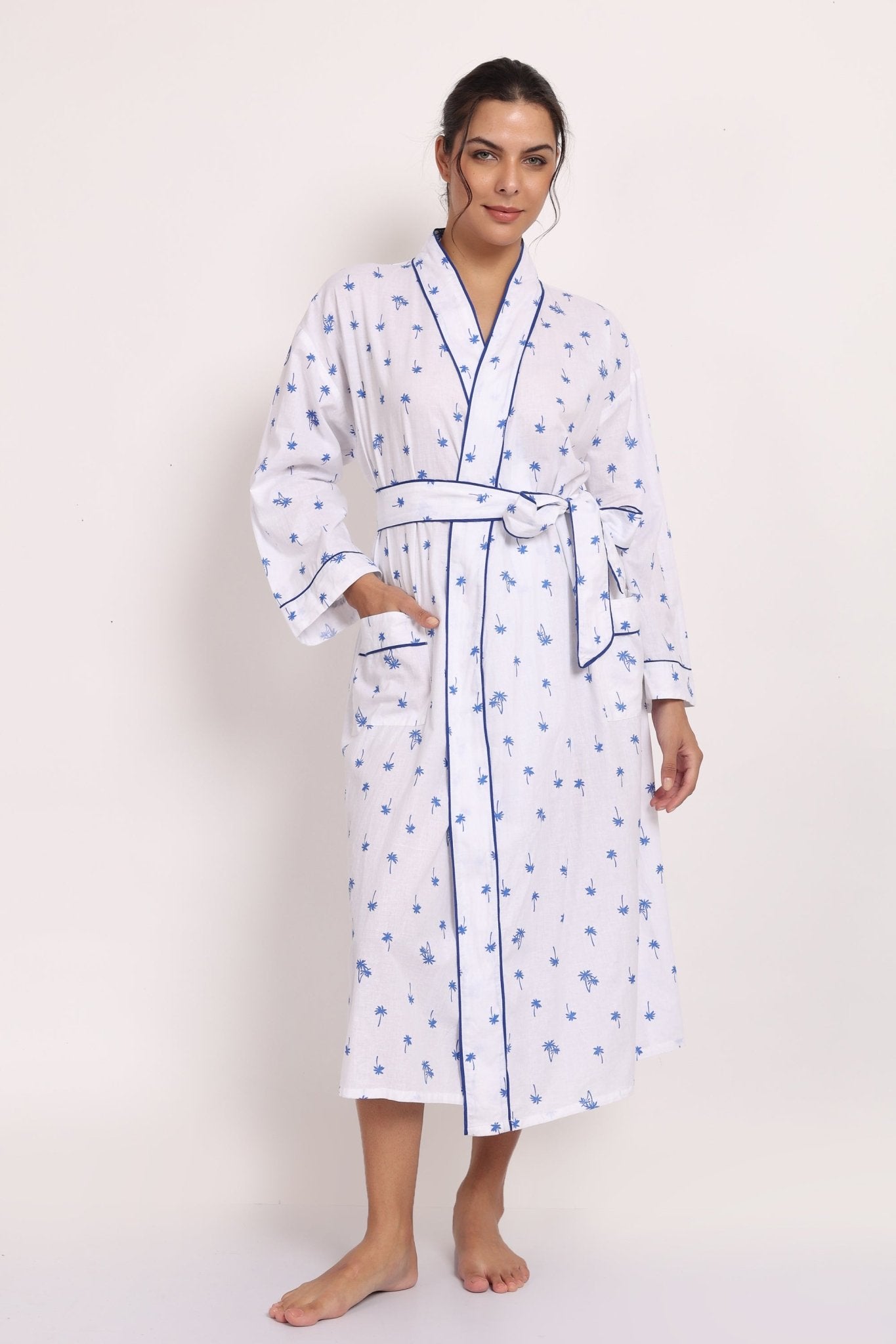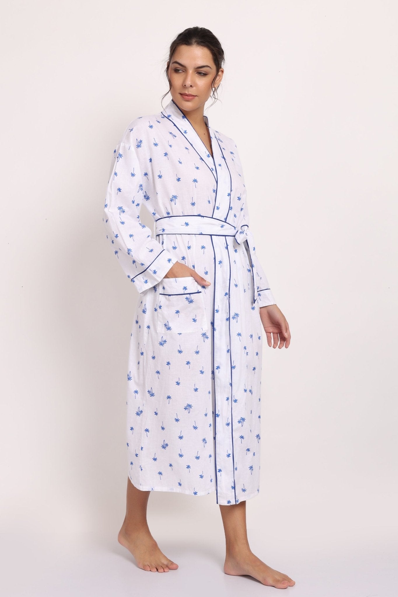 This great cotton bathrobe pairs beautifully with the matching Hamptons Palm Print Pintuck nightie or the Hamptons Palm Print PJ Set. The flattering wrap design is both stylish and practical - especially with the addition of handy pockets - and the navy contrast piping adds a sophisticated touch. The light cotton voile makes this robe ideal to throw over your nightwear and swan about the house in cool comfort.