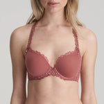 Model wearing Marie Jo Jane Padded Heart Shape Bra in Red Copper from The Foundation, featuring embroidered cups, plunge fit, and adjustable straps. close up