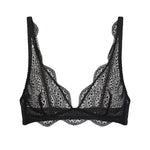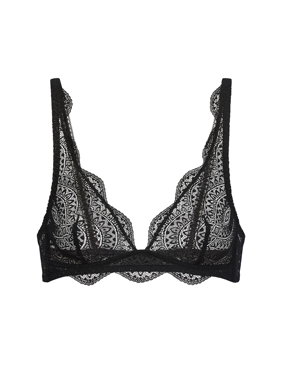 The Karma Wirefree Bra from Simone Perele is crafted with Italian jacquard lace for a triangle bralette that enhances your natural shape. The plunging neckline adorned with scalloped lace adds a sexy touch, while the small underbust band provides support.