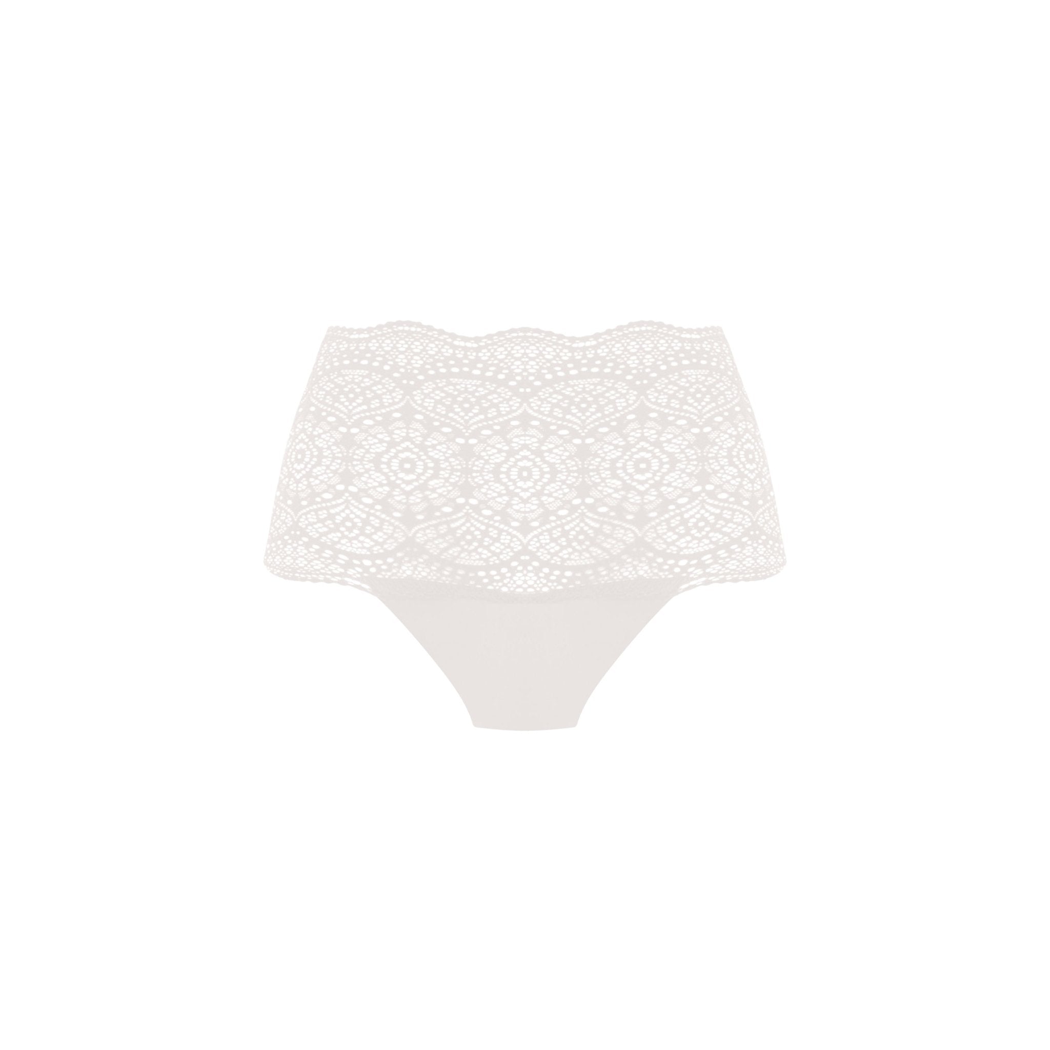 Elegant ivory lace brief with a full-coverage, high-rise design. Lightweight and seamless, ideal under white or pale garments for invisible comfort.