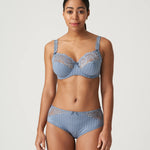 Model wearing Madison Full Brief in Atlantic Blue, showing lace that wraps from hip to back for a seamless finish.