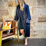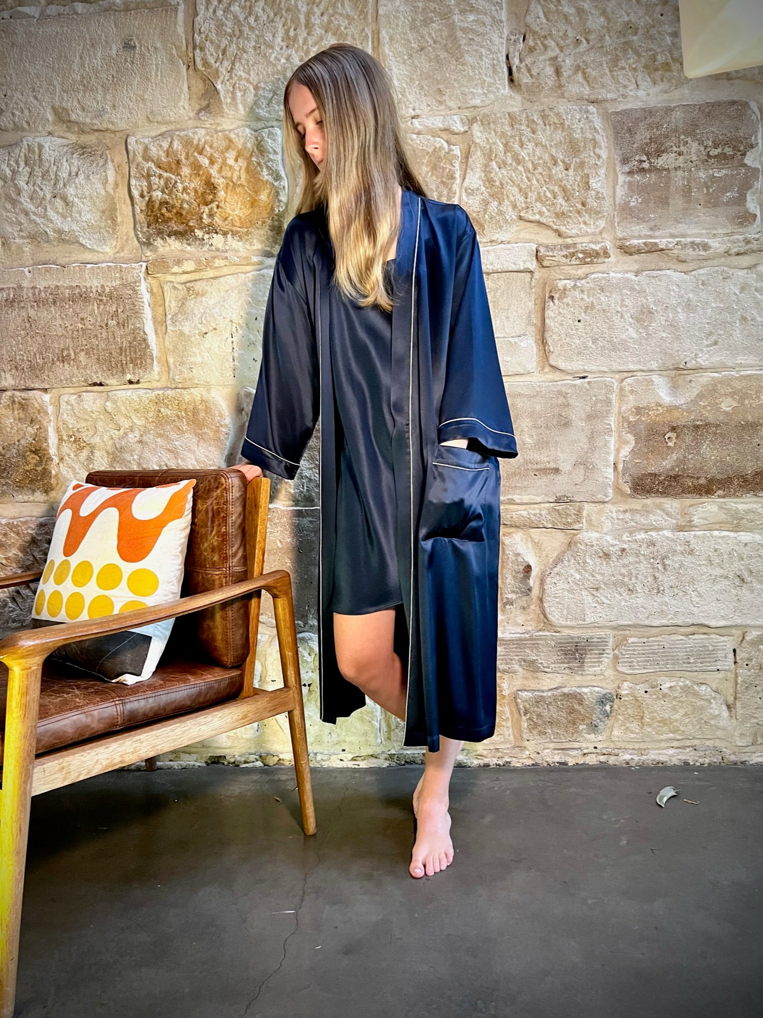 The Marie Kimono has the added touch of a contrast silk piping, tie waist and mid shin length.