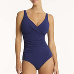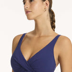 From Sea Level, the Messina Cross Front Multifit One Piece swimsuit is great for bust sizes up to an E Cup. Without underwires digging in, it features soft cup support in a cross over design with tummy ruching and adjustable and convertible straps for extra fit assurance and flexibility.