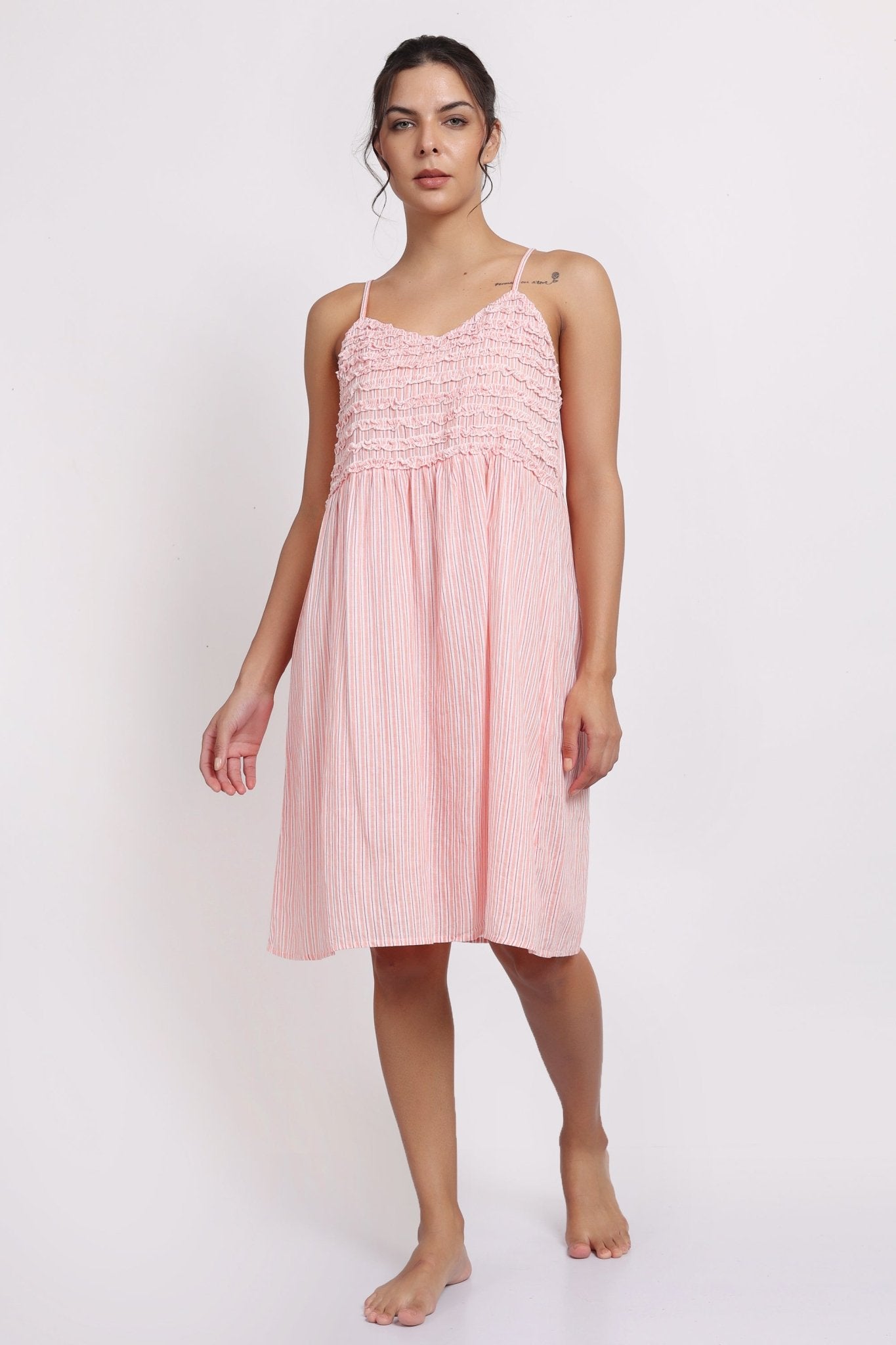 The Passionflower spaghetti strap 100% cotton nightie by Lotus is the ultimate in summer comfort. Made from the finest Indian cotton voile in this lovely coral stripe - this is a pure cotton nightdress that can double as a sundress - perfect for both summer days and nights!