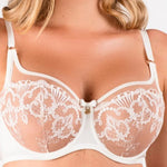 Model wearing Samanta Perla Soft High Apex Bra in Ivory – front view showcasing embroidered lace – The Foundation