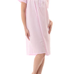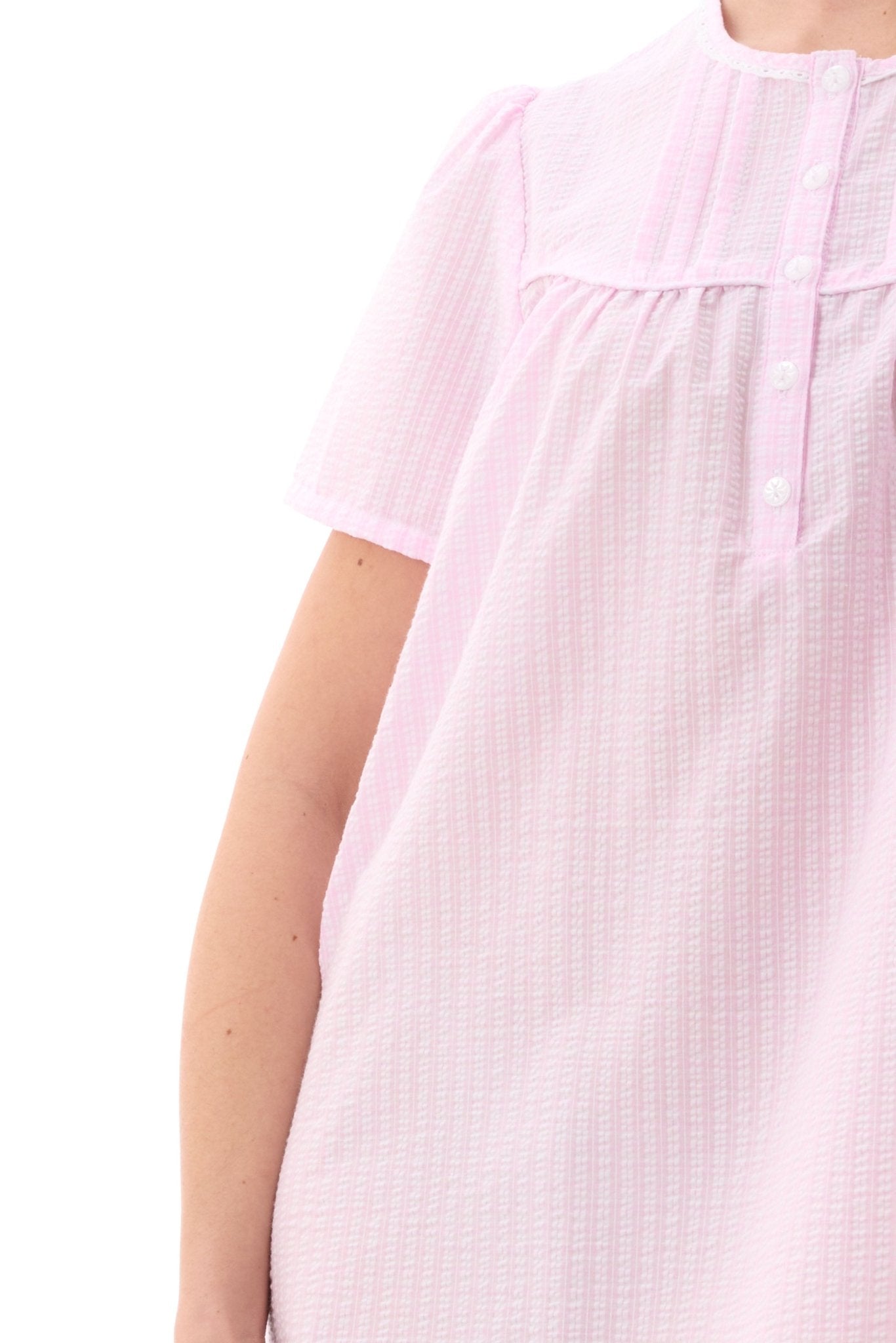Pretty in soft pink and white check, our seersucker short sleeve nightie is ideal for summer. Featuring a curved front yoke line with pin tucks and lace. This nightie has a 5 button placket opening.  This short nightie sits just below the knee, a timeless summer nightie.