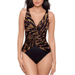 MiracleSuit Raya de Safari Charmer one piece swimsuit has gold embellishments at the front and abstract animal print in brown and black gathered to the middle. The Charmer is a flattering style with soft bra cups (no underwire) and mid scoop back.  Check out the matching beaded kimono in the same collection (sold separately) and make a stunning set.