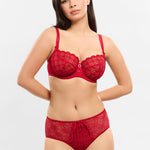 The Imperial Red colourway is flamboyant and captivating, a bold shade with vibrant energy that is truly a confidence booster. With its elegant embroidered patterns and graceful curves, the Romy Full Brief is an exquisite addition to your lingerie drawer. Pair with the Empreinte Romy Low Necked Bra in Imperial Red for a striking and perfectly coordinated lingerie set.