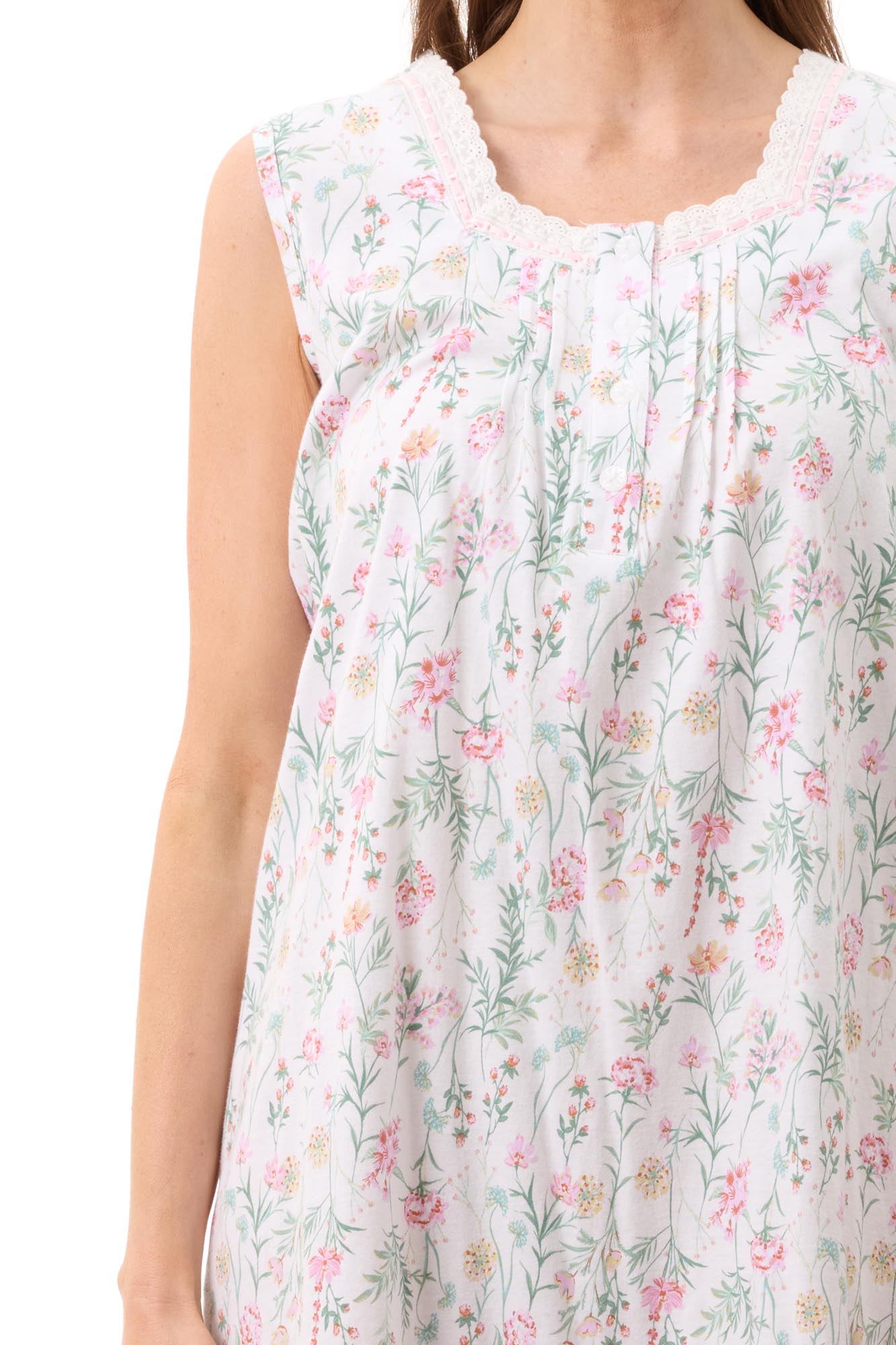 With the feminine lace and ribbon detail on the neckline, front button placket and delicate pintuck detailing - this sleeveless summer nightie has everything you could ask for in comfortable, stylish sleepwear.