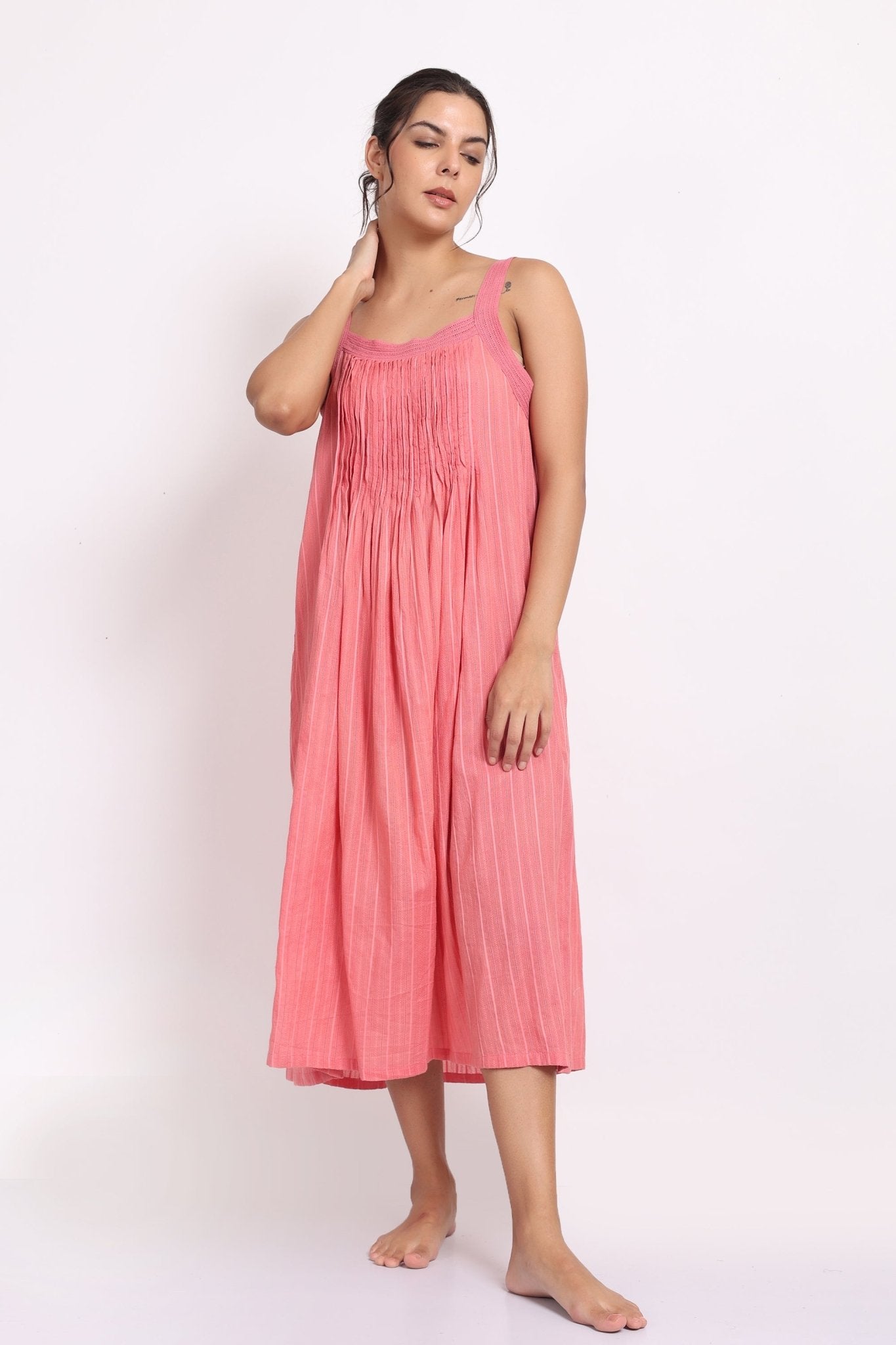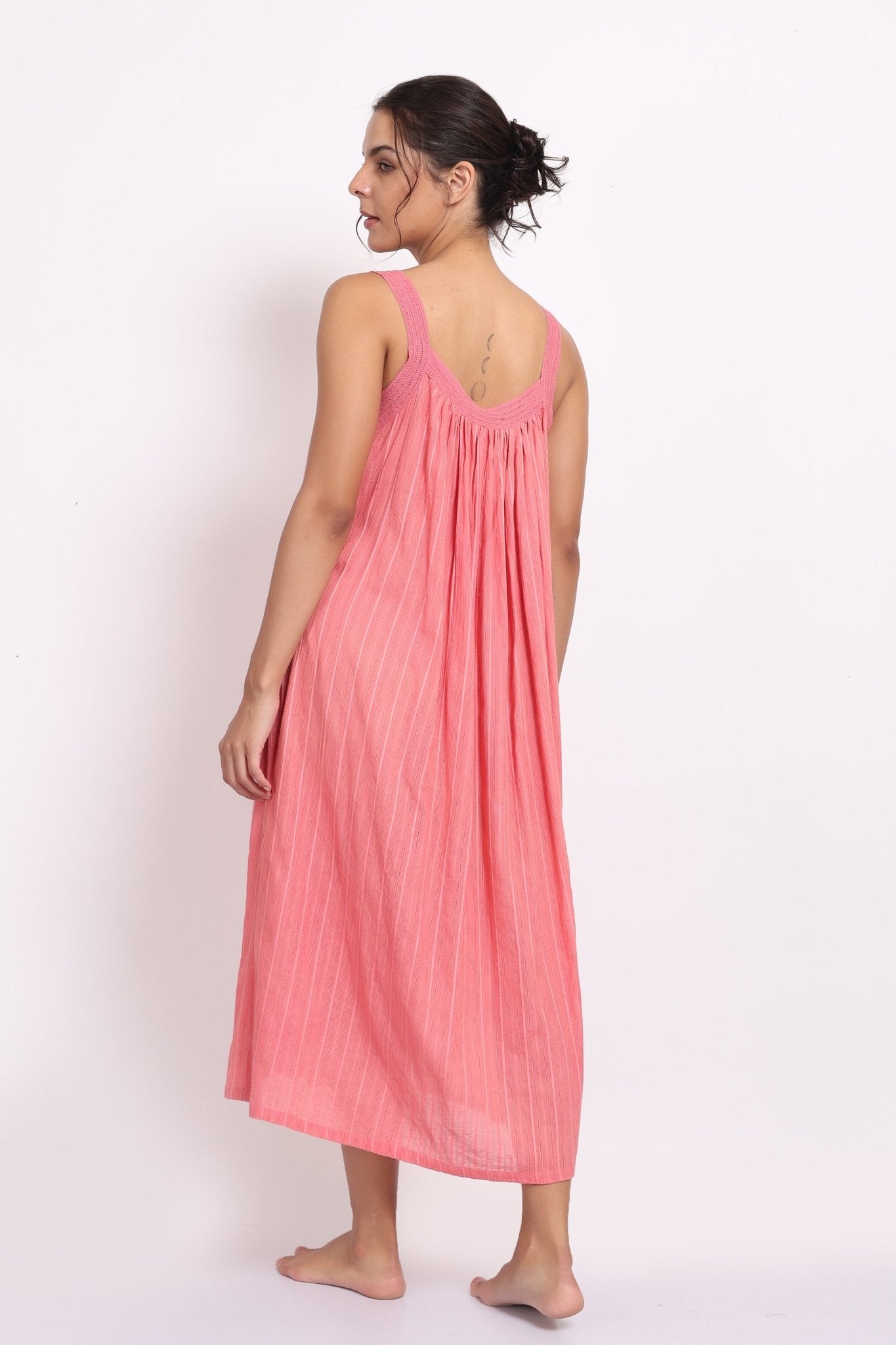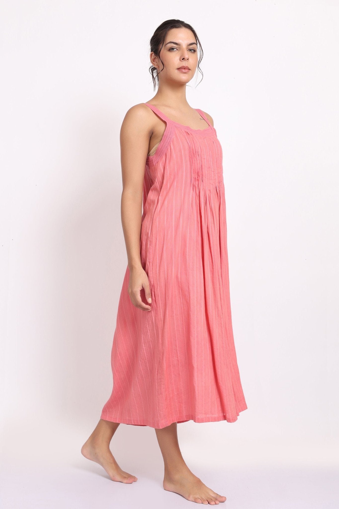 The Self Stripe Strappy Cotton nightie by Lotus is a classic cotton nightdress style. Made from the finest Indian cotton voile with a subtle stripe detail in a lovely coral hue - this pure cotton sleepdress is designed with both style and comfort in mind.