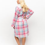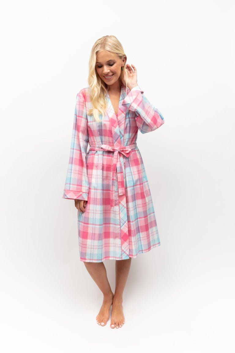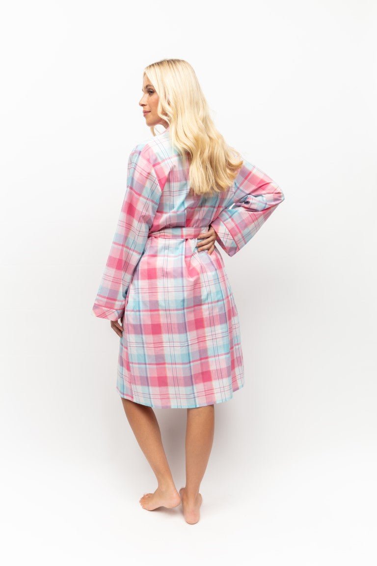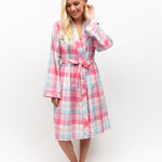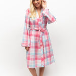 Crafted from 100% super-soft cotton, it ensures comfort on cooler nights and mornings. The long sleeves and wrap-front kimono style, trimmed with pink modal, add a touch of sophistication. This pink mix check features a classic dressing gown style, with its self-fabric belt providing a tailored fit, making it an exquisite addition to your luxury loungewear collection.