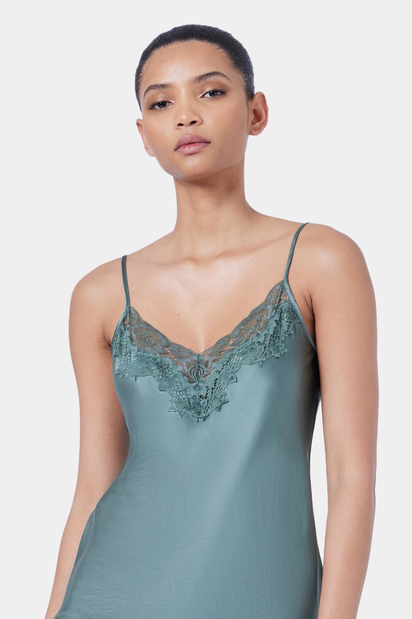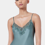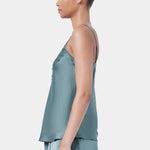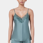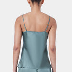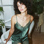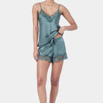 The new moss colourway has just arrived in this lovely Cami/Short set featuring a classic V-neck camisole style that falls to the top of the hip. Spaghetti straps from the same silk are adjustable for a perfect fit. The shorts are not too short and sit comfortably on the hip - with an elasticated back and drawstring front for the perfect fit. Finished with a decadent 3" lace trim.