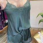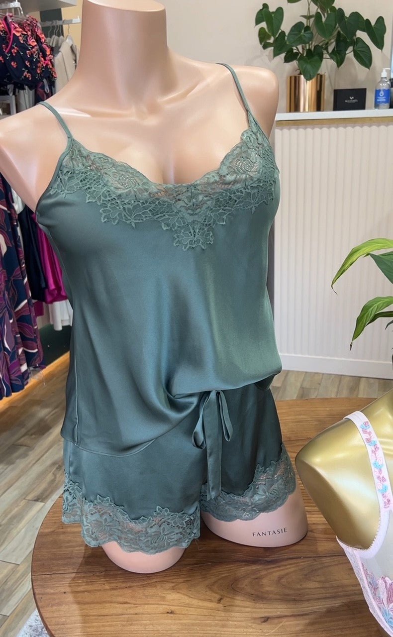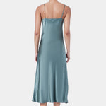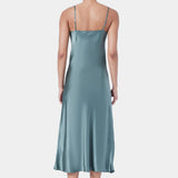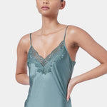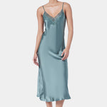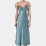 The new moss colourway has just arrived in this lovely Slip featuring a classic V-neck style, trimmed with decadent 3" lace and falls to mid calf. Spaghetti straps from the same silk are adjustable for a perfect fit.