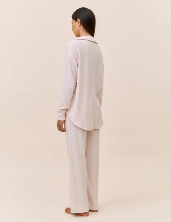Papinelle Super Soft Waffle Open Collared Long Sleeve Top and straight leg lounge pant is a great lounging set by Papinelle know for softness and warmth. With a soft waffle texture, this Papinelle Waffle set is great sleepwear or loungewear for women. New Winter Rose colour is a soft and subtle pink.